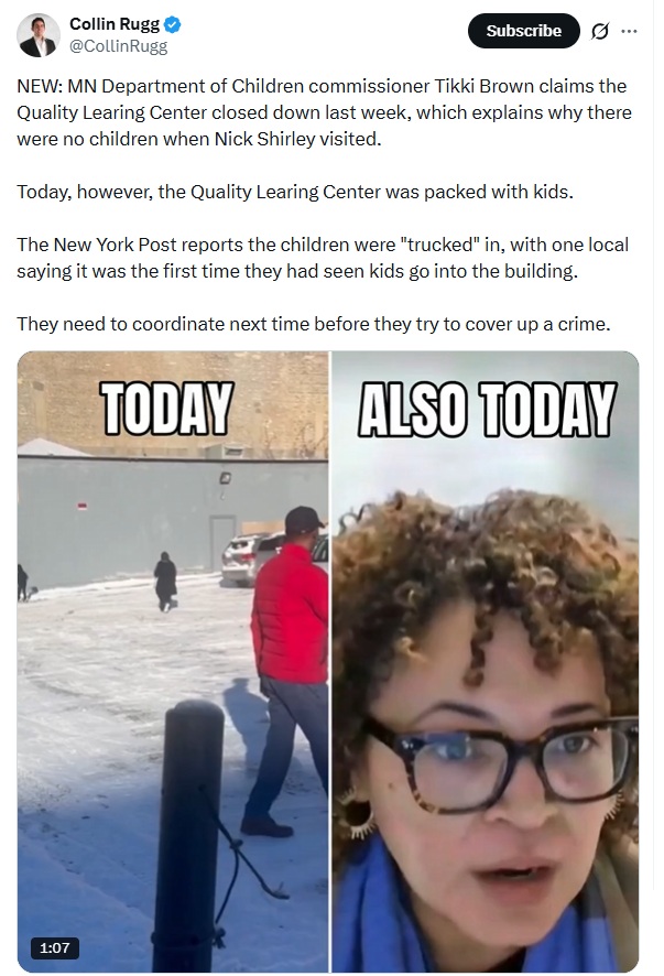 Also this:https://x.com/CollinRugg/status/2005845252247318729>NEW: MN Department of Children commissioner Tikki Brown claims the Quality Learing Center closed down last week, which explains why there were no children when Nick Shirley visited.>Today, however, the Quality Learing Center was packed with kids.>The New York Post reports the children were "trucked" in, with one local saying it was the first time they had seen kids go into the building.lying motherfuckers