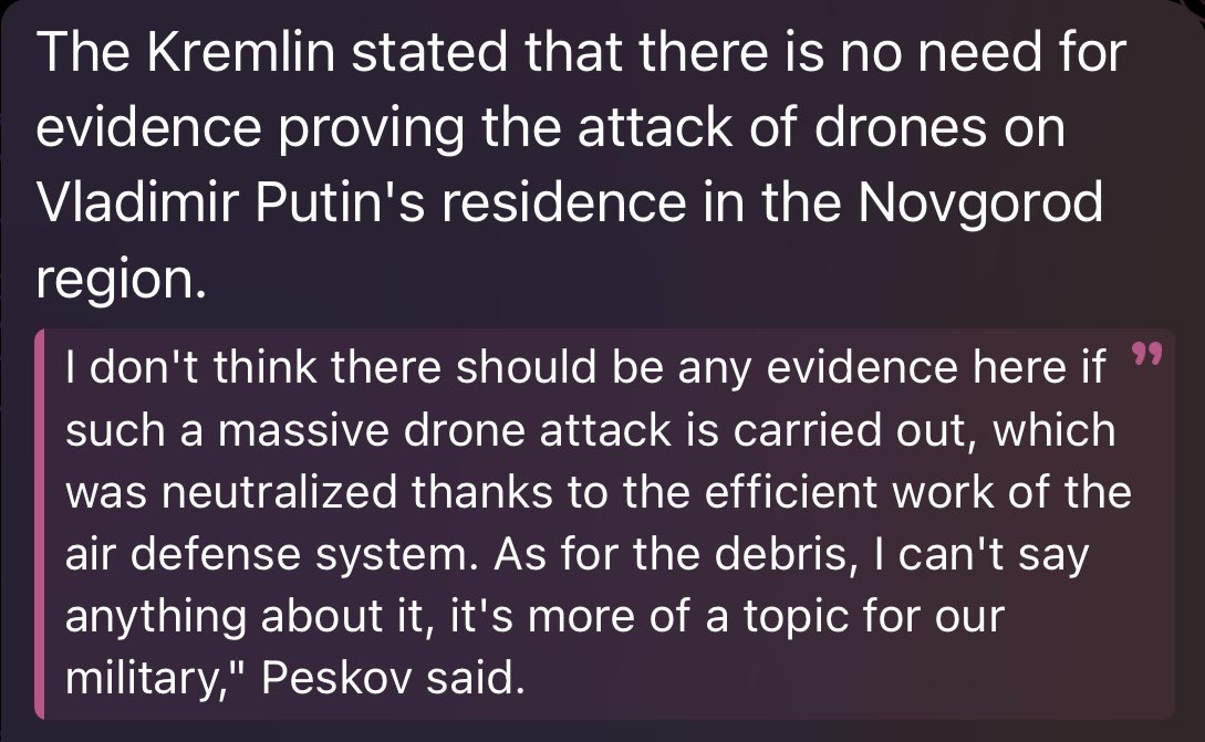 >Putin's whereabouts classified after claims of an attack on his residence…>"As for the president's whereabouts, in the current circumstances this topic is not subject to public discussion," said Peskovlol