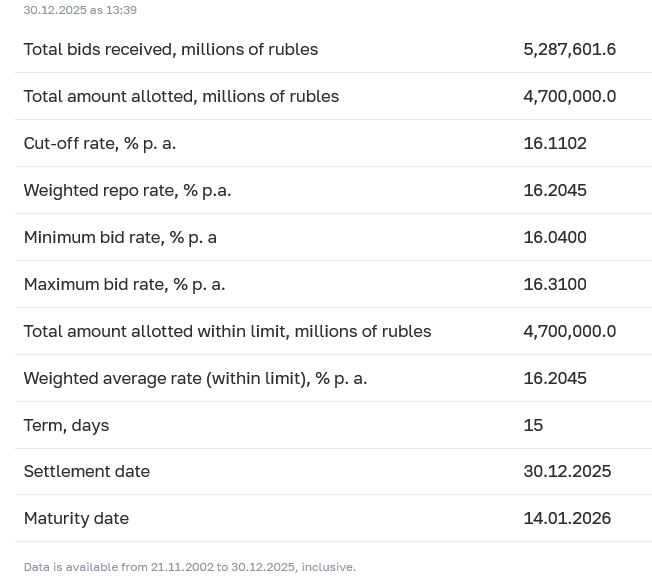 >>524635238Did a bit of digging and live data is likely paywalled. Fortunately the bank of Russia posts dated charts and maps them against other money market rates. This picture is worth a thousand words.p. 104, published Novhttps://www.cbr.ru/Content/Document/File/180951/on_eng_2026(2027-2028).pdf