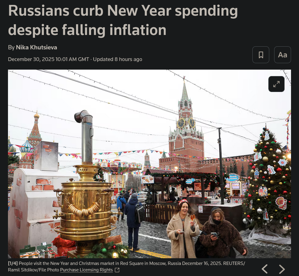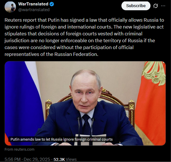 Reuters report that Putin has signed a law that officially allows Russia to ignore rulings of foreign and international courts. The new legislative act stipulates that decisions of foreign courts vested with criminal jurisdiction are no longer enforceable on the territory of Russia if the cases were considered without the participation of official representatives of the Russian Federation.https://x.com/wartranslated/status/2005699364614967457?s=20>29thhttps://www.reuters.com/world/putin-amends-law-let-russia-ignore-foreign-criminal-courts-2025-12-29/
