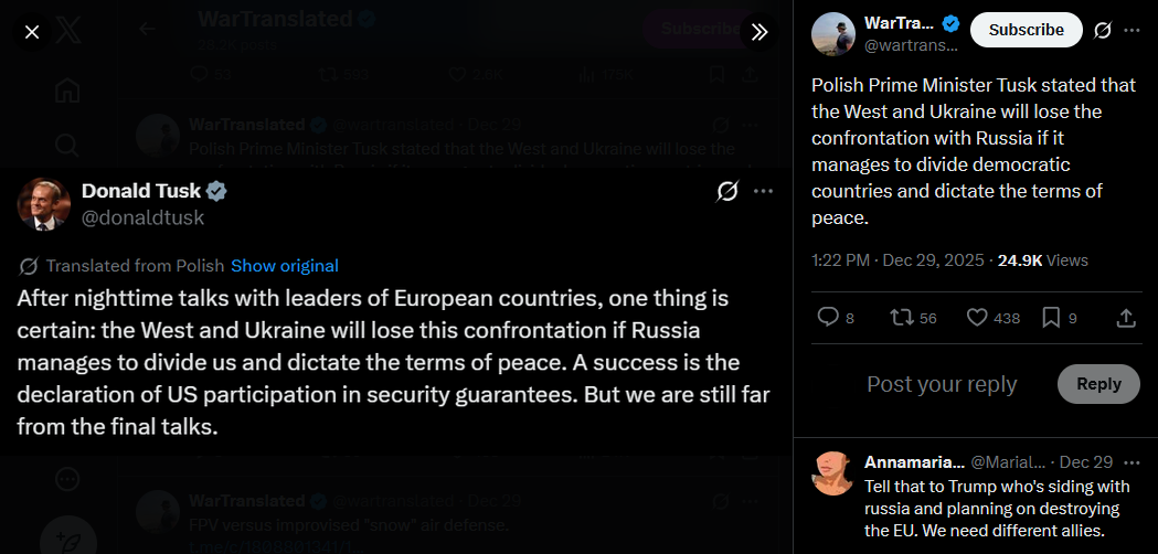 Polish Prime Minister Tusk stated that the West and Ukraine will lose the confrontation with Russia if it manages to divide democratic countries and dictate the terms of peace.https://x.com/wartranslated/status/2005630429433573798?s=20>29th