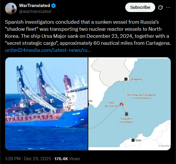 Spanish investigators concluded that a sunken vessel from Russia’s "shadow fleet" was transporting two nuclear reactor vessels to North Korea. The ship Ursa Major sank on December 23, 2024, together with a "secret strategic cargo", approximately 60 nautical miles from Cartagena.https://united24media.com/latest-news/russian-ghost-ship-sank-while-smuggling-nuclear-reactor-parts-likely-bound-to-north-korea-14622?utm_source=chatgpt.comhttps://x.com/wartranslated/status/2005634886917296566?s=20>29thpic 1https://files.catbox.moe/czkcz2.jpgpic 2https://files.catbox.moe/1jkqtj.jpg>>524650399 a general buys a massive yacht don't ask him where he got the money from