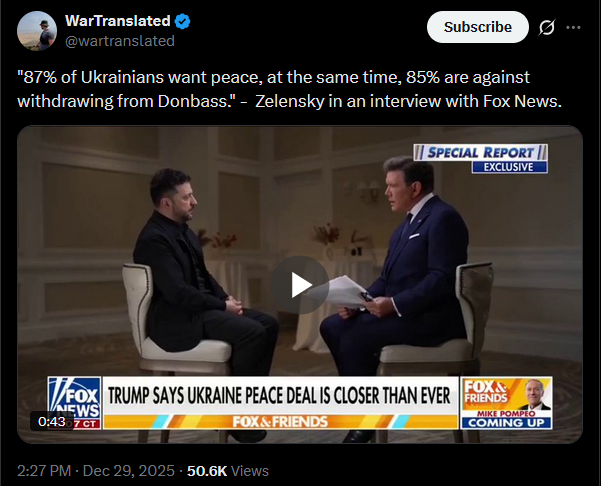 "87% of Ukrainians want peace, at the same time, 85% are against withdrawing from Donbass." - Zelensky in an interview with Fox News.https://x.com/wartranslated/status/2005646978794074211?s=20>29thhttps://files.catbox.moe/olcj9e.mp4