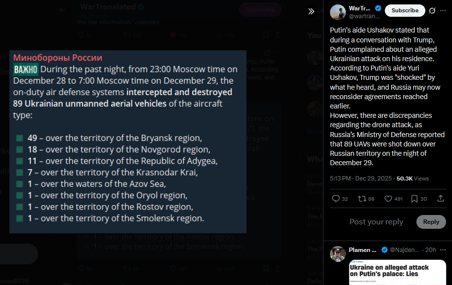 >>524650850 oh no, just retardedPutin’s aide Ushakov stated that during a conversation with Trump, Putin complained about an alleged Ukrainian attack on his residence. According to Putin’s aide Yuri Ushakov, Trump was "shocked" by what he heard, and Russia may now reconsider agreements reached earlier. However, there are discrepancies regarding the drone attack, as Russia’s Ministry of Defense reported that 89 UAVs were shot down over Russian territory on the night of December 29.https://x.com/wartranslated/status/2005688743995318714?s=20>29th