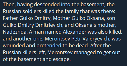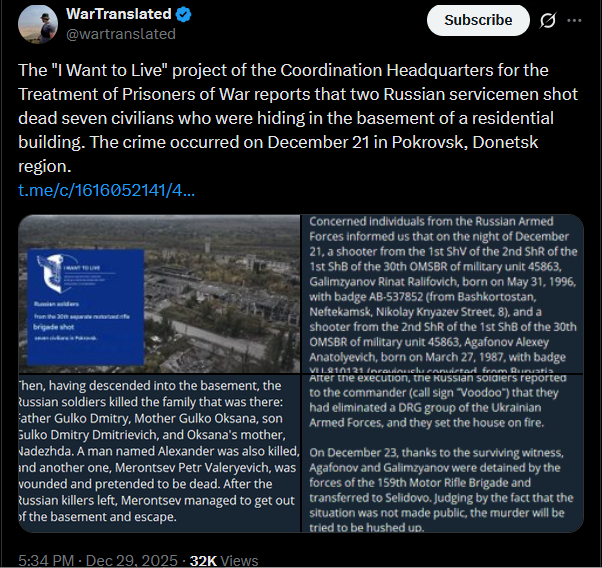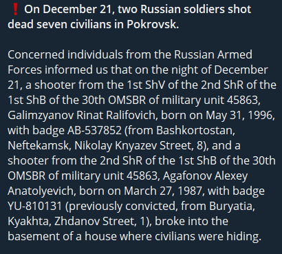 >>524650934>If only the Kremlin enforced laws, stamped out corruption, and served its own peopleit's a mafia gas station, with very old nooks The "I Want to Live" project of the Coordination Headquarters for the Treatment of Prisoners of War reports that two Russian servicemen shot dead seven civilians who were hiding in the basement of a residential building. The crime occurred on December 21 in Pokrovsk, Donetsk region.https://t.me/c/1616052141/4323https://x.com/wartranslated/status/2005693853135757649?s=20pic 1https://files.catbox.moe/yenao0.jpgpic 2https://files.catbox.moe/4bpouh.pngpic 3https://files.catbox.moe/5qt3t5.pngpic 4https://files.catbox.moe/7sk21j.png