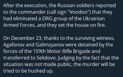>>524651093>The "I Want to Live" project of the Coordination Headquarters for the Treatment of Prisoners of War reports that two Russian servicemen shot dead seven civilians who were hiding in the basement of a residential building. The crime occurred on December 21 in Pokrovsk, Donetsk region.pic 2
