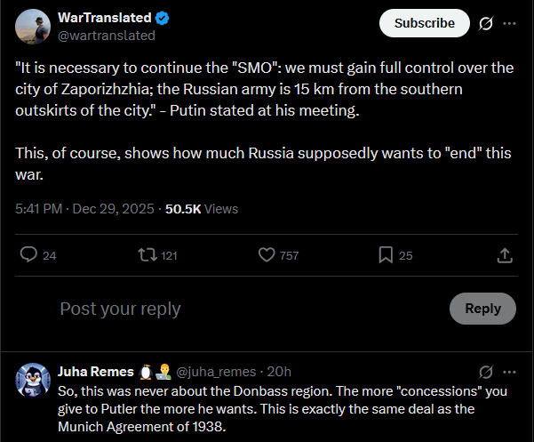 >>524650694"It is necessary to continue the "SMO": we must gain full control over the city of Zaporizhzhia; the Russian army is 15 km from the southern outskirts of the city." - Putin stated at his meeting.This, of course, shows how much Russia supposedly wants to "end" this war.https://x.com/wartranslated/status/2005695576684519502?s=20>>524651150 that's not a uhg bake anon