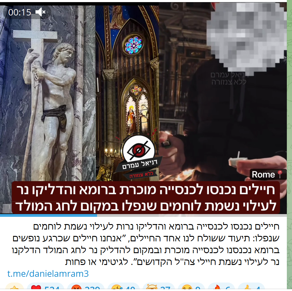 >>524640714>What is going on?Soldiers entered a church in Rome and lit candles in memory of fallen fighters: footage sent to us by one of the soldiers, "We are soldiers currently on leave in Rome. We entered a familiar church and instead of lighting a candle for Christmas, we lit a candle in memory of the holy IDF soldiers."