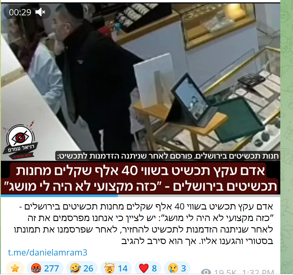 >>524651850>A man scammed jewelry worth 40,000 shekels from a jewelry store in Jerusalem - "I had no idea someone this professional existed": It should be noted that we are publishing this after giving the jeweler a chance to return it, after we posted his photo in a story and reached out to him. But he refused to respond
