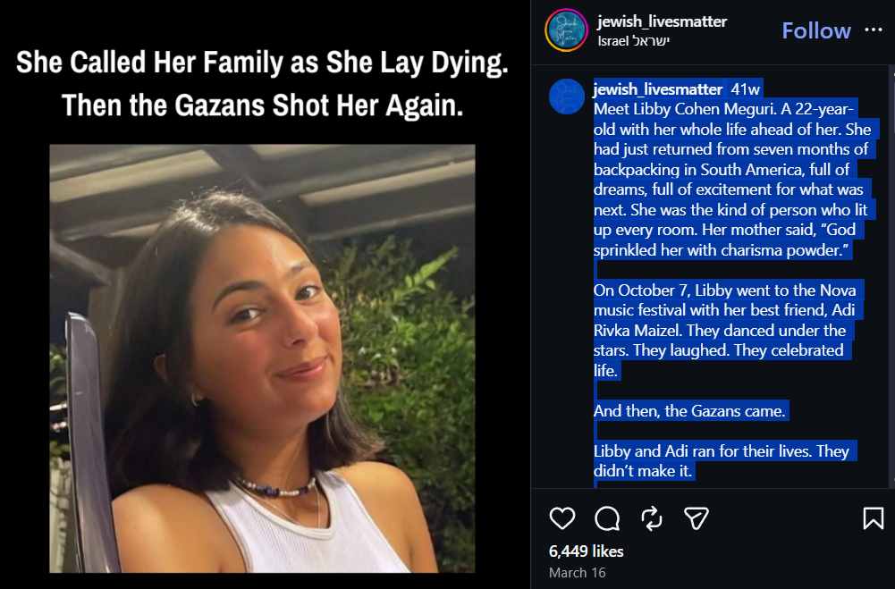 jewish_livesmatter's profile picturejewish_livesmatter 41wMeet Libby Cohen Meguri. A 22-year-old with her whole life ahead of her. She had just returned from seven months of backpacking in South America, full of dreams, full of excitement for what was next. She was the kind of person who lit up every room. Her mother said, “God sprinkled her with charisma powder.”On October 7, Libby went to the Nova music festival with her best friend, Adi Rivka Maizel. They danced under the stars. They laughed. They celebrated life.And then, the Gazans came.Libby and Adi ran for their lives. They didn’t make it.They were ambushed by terrorists who gunned them down in cold blood.Lying on the ground, bleeding, Libby called her family.“I love you,” she told them, her voice shaking.And then, the Gazans shot her again.They murdered her while she was on the phone with her family.This wasn’t war. This wasn’t resistance.This was pure evil.Libby was supposed to fall in love, build a future, chase her dreams - not die on the blood-soaked ground of a music festival.Now, her family is left picking up the shattered pieces of their lives. Her Instagram account, once a place for her adventures, is now a digital memorial. A space where tens of thousands of people grieve a young woman who should still be here.Say her name. Share her story. Because Gazans didn’t just kill Libby - they stole a lifetime of memories that should have been made.