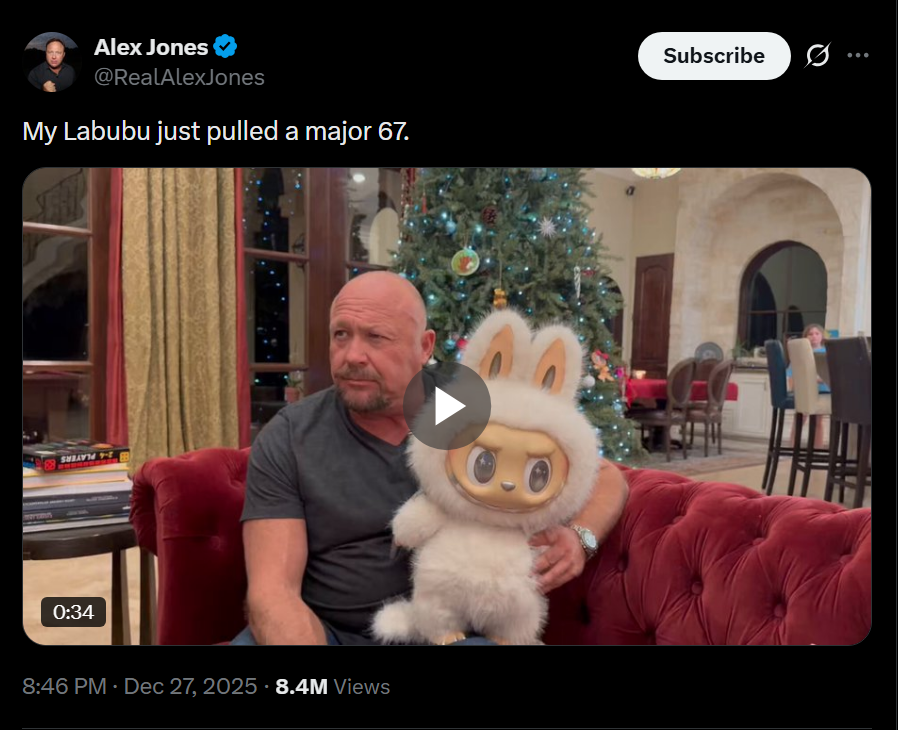 >>524652380Meanwhile, Alex (((jones))) is posting pictures with labubu’s