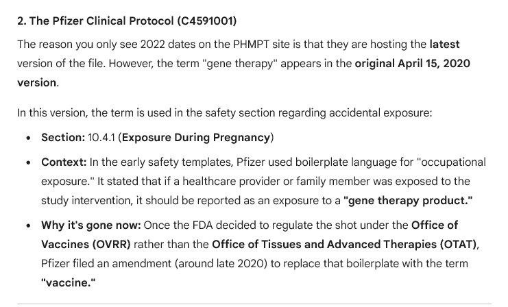 >>524667069Shit's fucked. I'm trying to use Gemini to find the EUA document that I'm sure I saw "gene therapy" in, and while Gemini tells me that it was present in earlier version of FDA filings, that those were only made public later, and that the specific document I'm probably thinking of was amended 20 times since, including to remove instances of "gene therapy" and use the term "vaccine" instead. Hard to know if I'm misremembering and Gemini is playing along or not, but it did find that SEC quote for me here >>524666479 even though that's not the specific document I am thinking of.I hate this 1984 reality where there is no source of truth anymore because everything is edited.