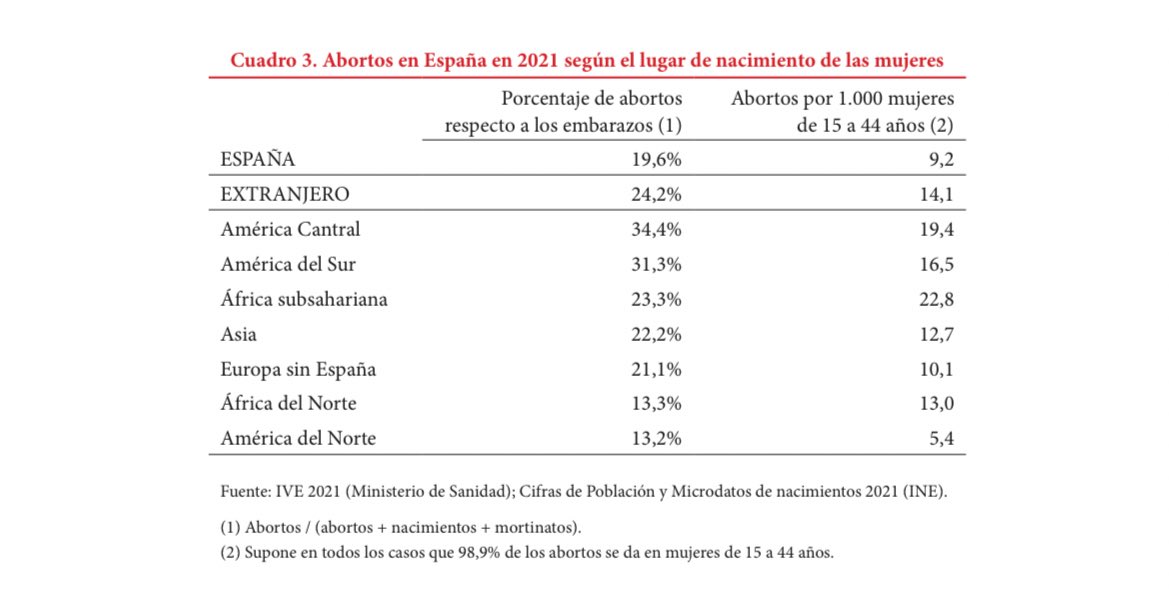Abortion rate in Spain, by origin:>Spain: 19,6%>Central America: 34,4%>South America: 31,3%>Subsaharan Africa: 23,3%>Non-Spain Europe: 21,1%>North Africa: 13,3%>North America: 13,2%