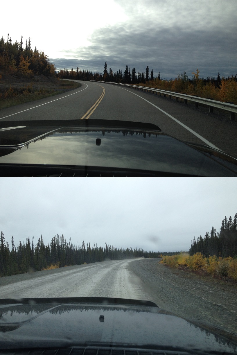 Beautiful Alaska road on top. Canada road 5 minutes after border on bottom. They fluoridate their water is what I'm guessing.