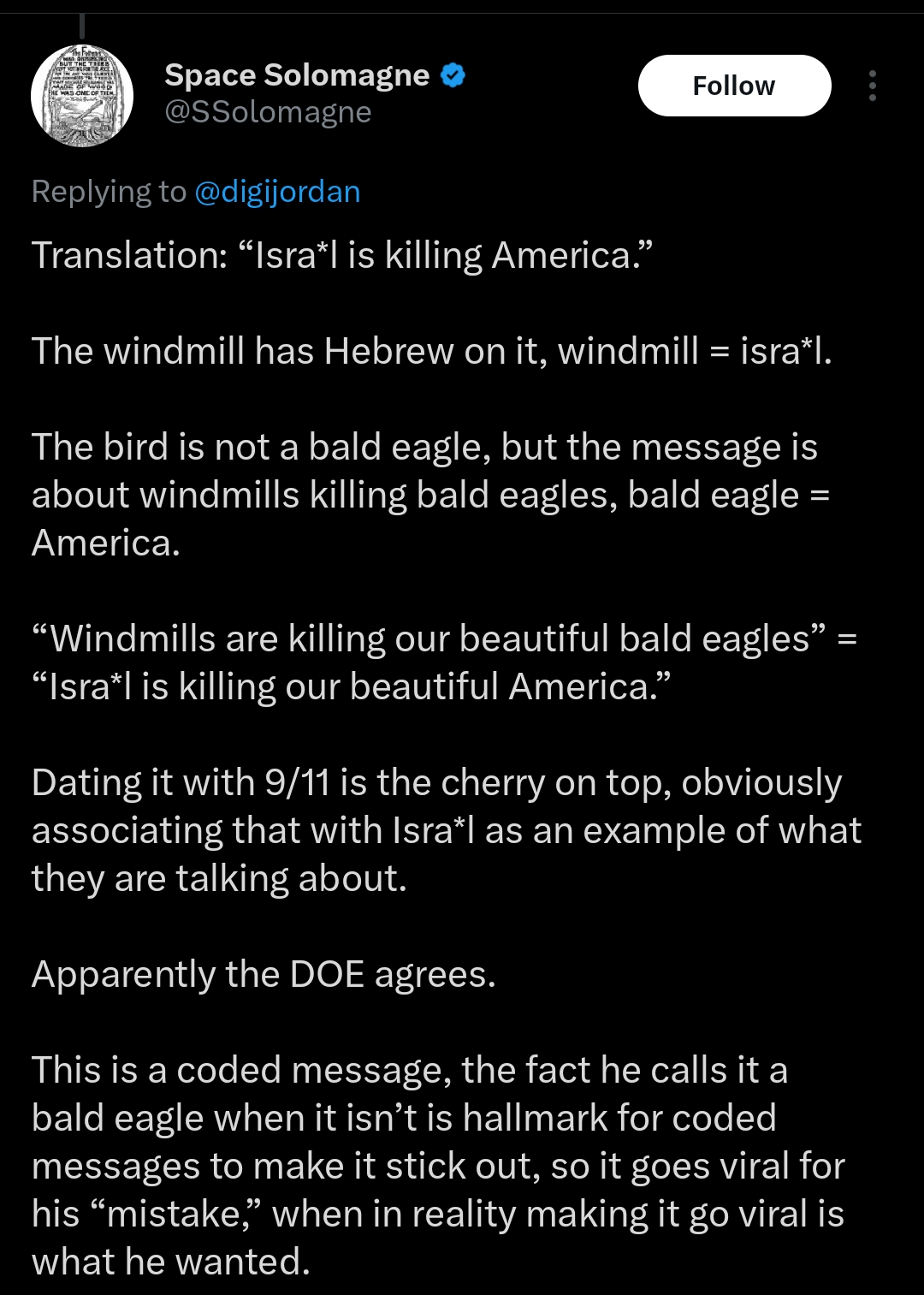 It's hilarious that 99% of rhe Trump windmill tweet are by tards that don't understand it80% are calling him senile40% Claim it's a message from his kike/pissrael masters5% Claim it's "Q shit"Maybe 1 reply per 10 tweets identifies it correctly & only a couple identify that the point was to go viralEven (((MSM))) is writing articles deflecting from it's true meaning. Claiming it's just trump with dementiaBut they always miss the 13 tribes of kikes being the ones killing USA/americans (Edom)Missing rhat DOE retweeted it, the most powerful agency. That wr could destroy israel if we fought back or cut them off.