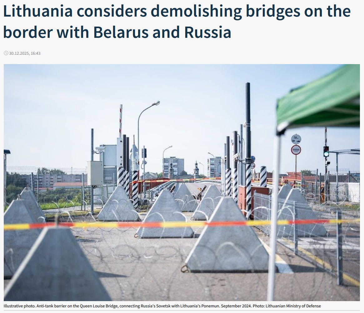 >It is part of the construction of the Baltic Defense Line >Lithuanians have noticed construction work underway on bridges near the border with Belarus almost simultaneously. The Lithuanian Armed Forces confirmed to the Lithuanian Radio and Television (LRT) website that this is part of the fortification measures agreed upon last July.>The military told LRT that these works are part of preparations for the construction of the Baltic Defense Line along the borders with Russia and Belarus. According to the plan, the bridges will be equipped with "engineering structures for attaching explosives.">Bridges and roads are selected based on the location of natural obstacles and their strategic importance for Lithuania's defense system, the military explained, as quoted by LRT.lt.