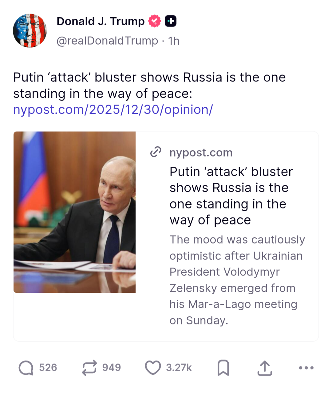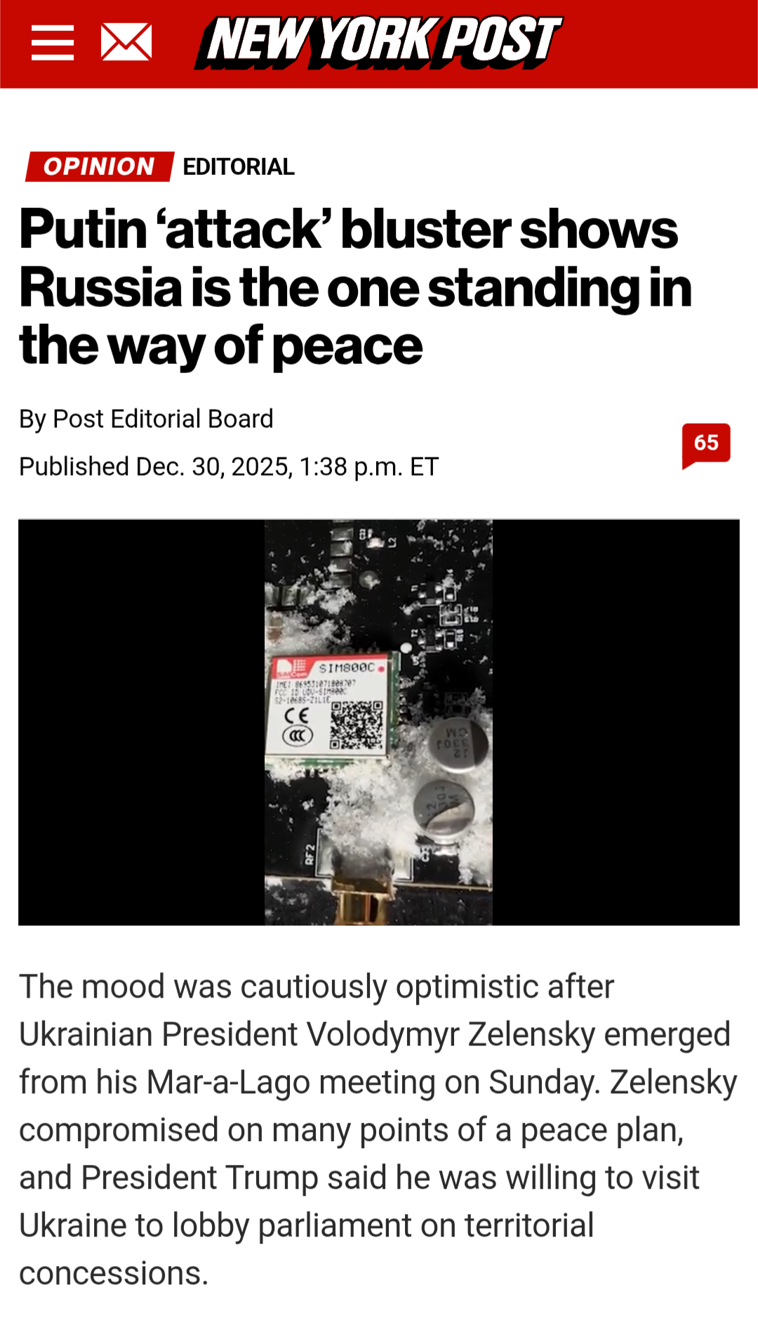 >>524719720Let's see what the article he is endorsing says>Putin claimed that the Ukrainians had launched drones to kill him at one of his many extravagant residences. Because of this, the Russians had no choice but to be “more rigid” in negotiations, Kremlin spokesman Dmitry Peskov blustered.>It’s rich that Putin, who has waged a brutal war for nearly four years, believes that any violence in his vicinity merits special outrage. After all, Russia launched 131 drones on Christmas at Kyiv and other cities, killing seven civilians. Civilians. The Kremlin specifically targets apartment buildings and power plants to punish the ordinary people of Ukraine. The Russians kidnap children. They torture and execute prisoners. Further, Moscow has tried repeatedly to assassinate Zelensky. Any attack on Putin is more than justified.>But here’s the rub: The drone strike likely never happened. Zelensky vigorously denied it. Peskov said the Russians could provide no evidence, and urged the press to “take the Kremlin’s word for it.”>No, we won’t.>Putin’s entire war is a lie, a “special military operation” to “de-Nazify” a country that isn’t run by Nazis. In this case, common sense points to an invented or embellished narrative to give Russia an excuse to reject Trump’s progress.>Just as he did in Alaska, Putin was offered peace and instead spat in America’s eye.>Vladimir Putin is not an honest broker who can see reason, nor a business opportunity to be unlocked.>The answer should not be more concessions, but a bigger stick. Kyiv has done its part. The onus should be on Putin to step up or face more stringent sanctions and more deadly weapons in Ukraine.>Despite his defiance, Putin’s actions smack of a deteriorating internal situation. His economy is stagnating. Propaganda is flailing as soldiers return with missing limbs. His victory is neither imminent nor inevitable. Spare us his crocodile tears and turn up the heat.