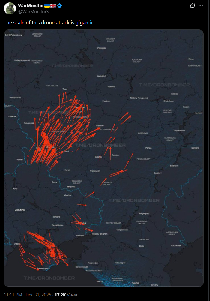 >>524721219Russia has accused Ukraine of launching 91 drones at Putin's residence after his phone call with Trump.Trump said he'd look into it.You'd think with all those radars, and satellites, and awacs they'd be able to tell if 91 long range drones were launched at Novgorod, which is between Moscow and St Petersburg, but no. Instead we get Trump seemingly endorsing an article that calls Putin a liar about it and says he deserves if true