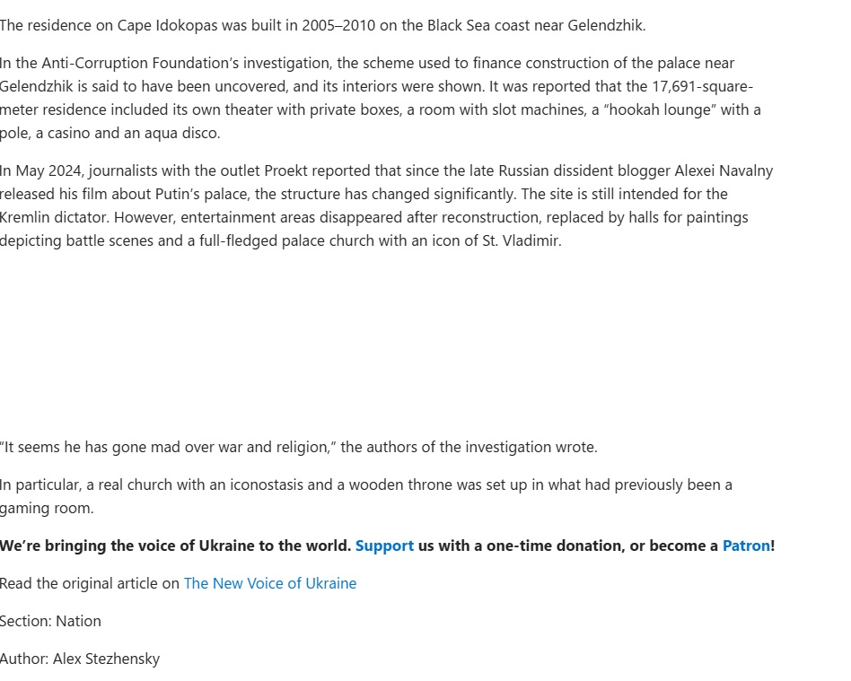 https://www.msn.com/en-us/news/world/former-yanukovych-dacha-journalists-find-128-million-putin-palace-in-occupied-crimea-photos/ar-AA1TiK5bPutin has gone insane! Reports show that Putin's palace in Crimea which was the Yanukovych house but Putin took it for himself, had a gaming room set up for Putin. In the new visit it appears the gaming room has been replaced with "church with an iconostasis and a wooden throne" !