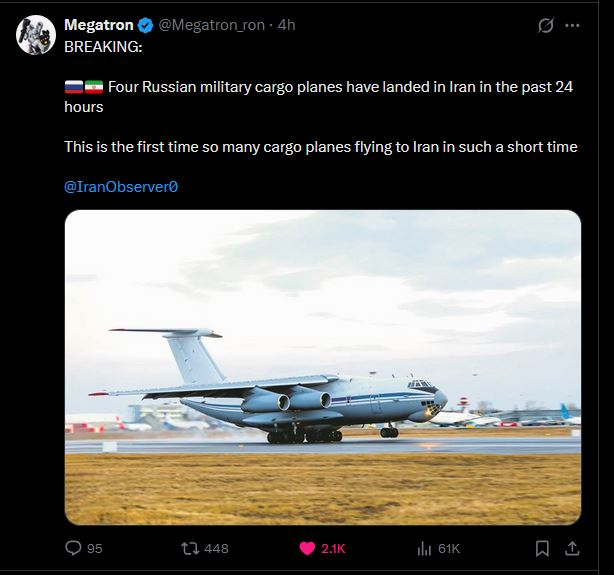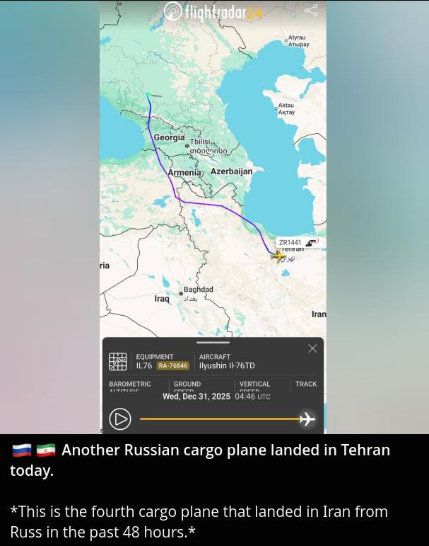 > Another Russian cargo plane landed in Tehran today.whars on board?also, an interesting flight path