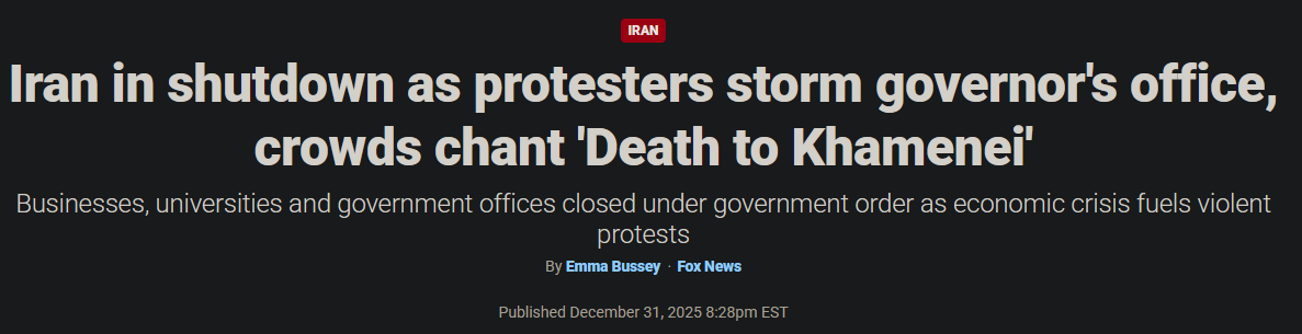 Iranian police have started to fire on protesters in Iran. Dozens have been killed all over the country.Flight-tracking data from Flightradar24 shows at least five Russian Il-76 cargo aircraft flying to Tehran in the past 48 hours, pointing to a spike in undeclared Russian deliveries to Iran.The situation for the islamic regime in Iran is becoming critical. Regime change very possible.Looks like Jews have won again.