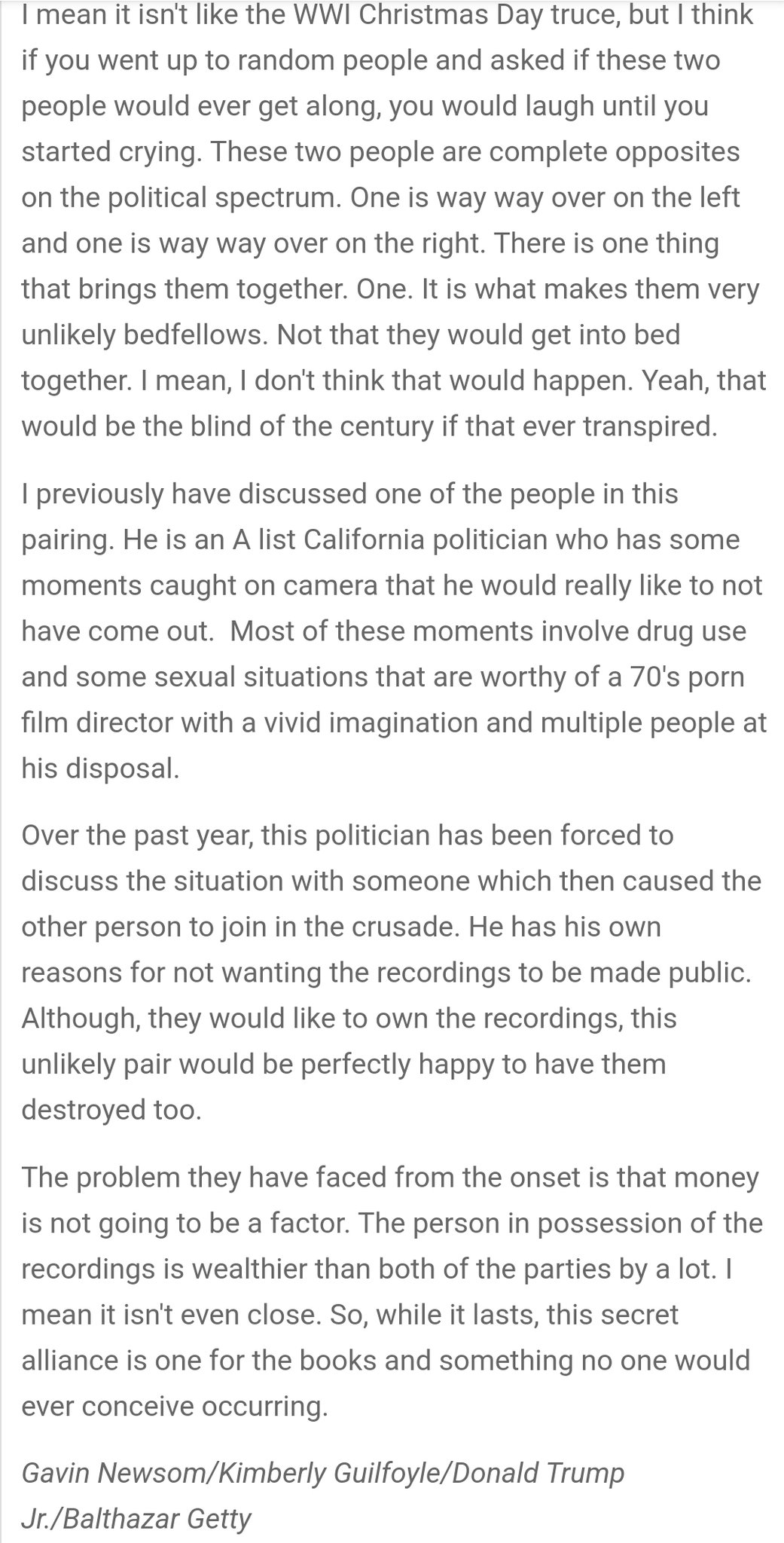 >>524778498How i see it- If you watch Trump videos from the Perot era, he has been amazingly consistent in his ideas, especially on things like free trade. Despite his glaring flaws, he had a purpose and direction informed by his years of adjacency to political power (especially Roy Cohn, but countless other as well). Trump had a goal and vision for the country(whether you agree w it or not doesn't change that), whereas political insiders are focused on further themselves and their career - Guys like Newsom who will do or say anything for power. Weak men like Newsom are the exact people who cripple society.