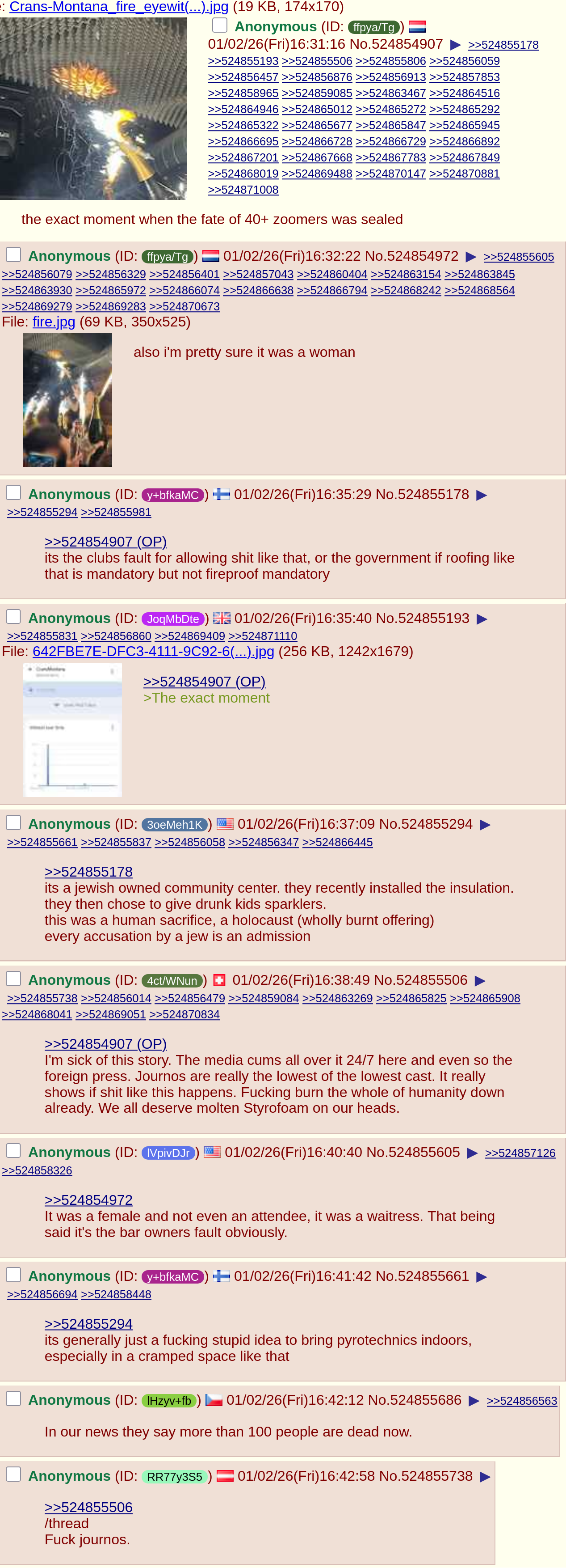 >>524854907Switzerland is actually a corrupt shithole with lots of money laundering and general globohomo nonsense (like being home to the WEF). There's a reason why Gadhafi wanted to break it up. Literal Mountain JewsThe bar area was located in a basement with no fire exits other than the stairs up to the main entrance. Such a building wouldn't be allowed in the EU+UK.