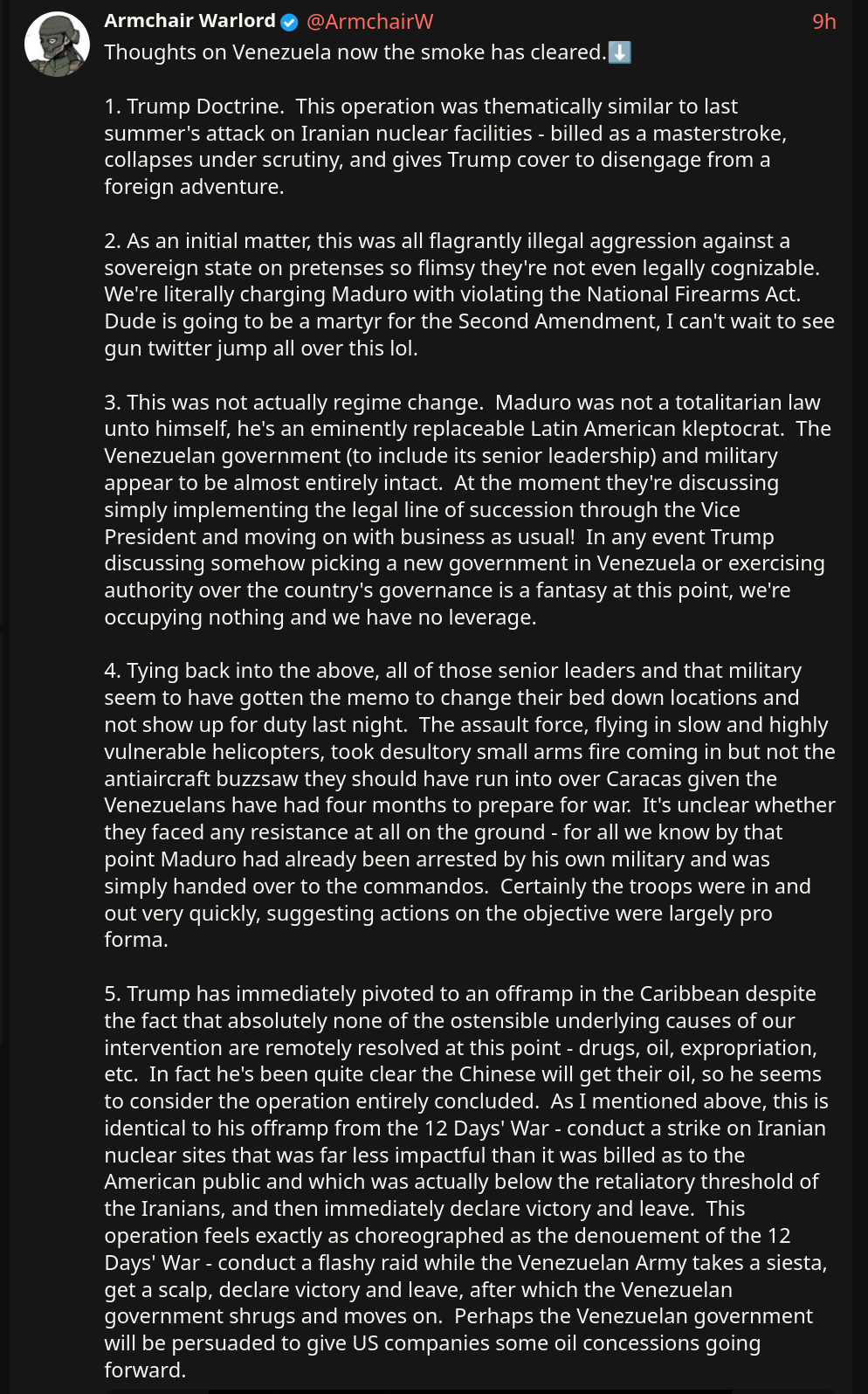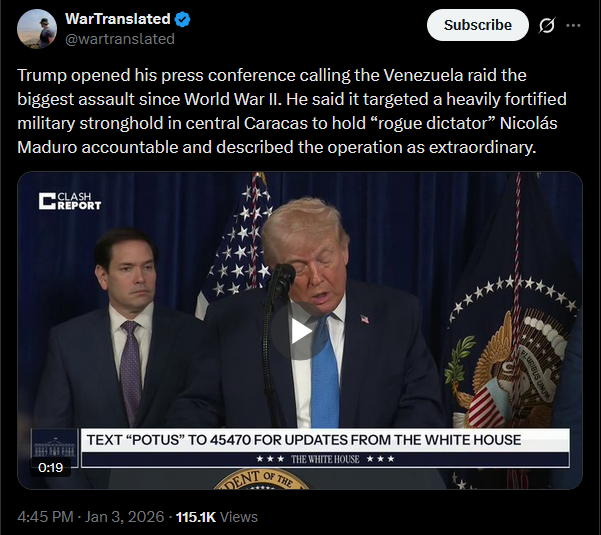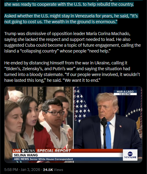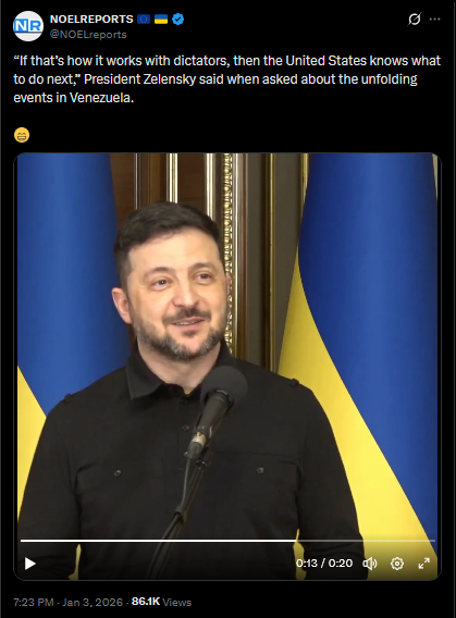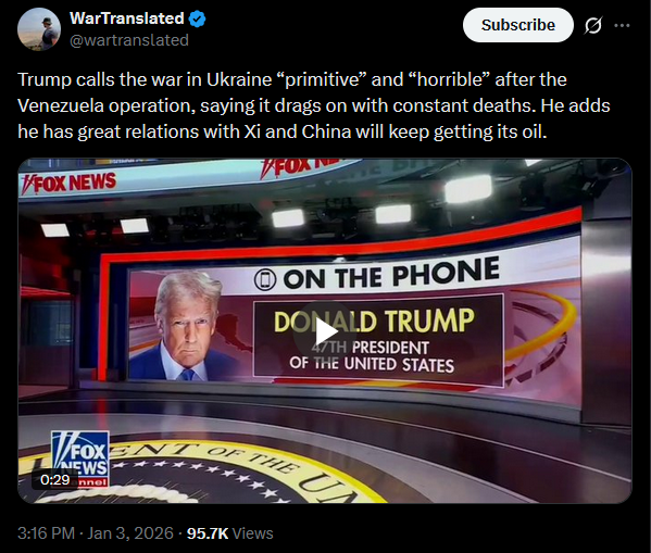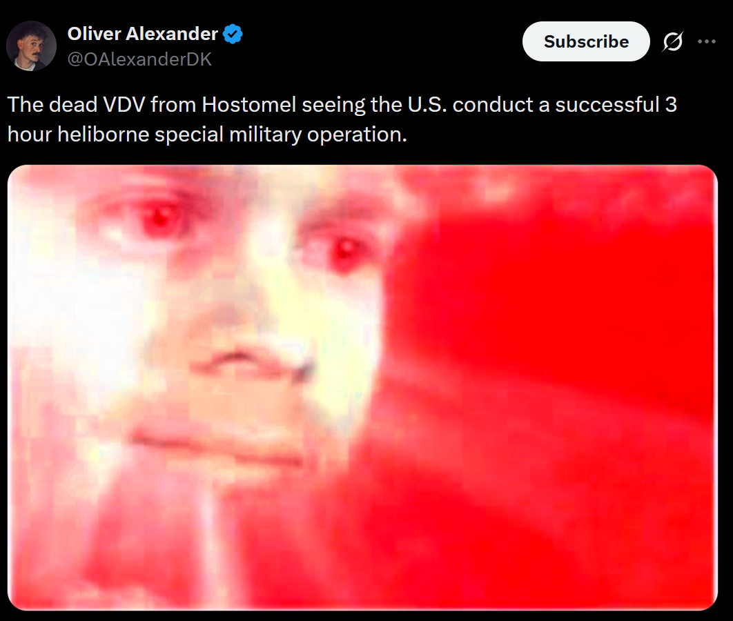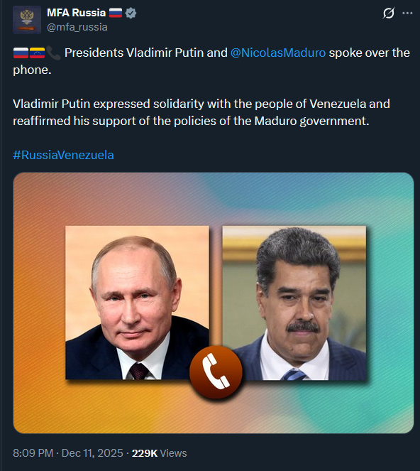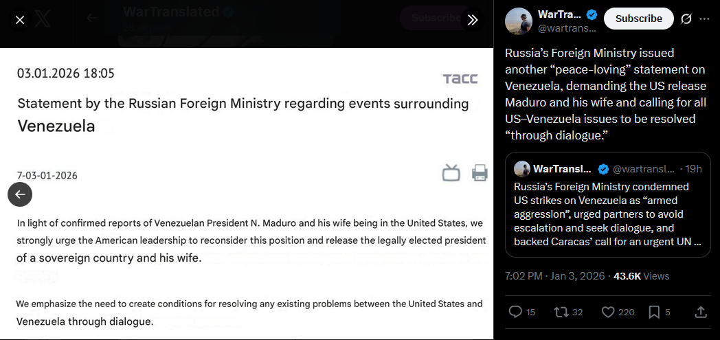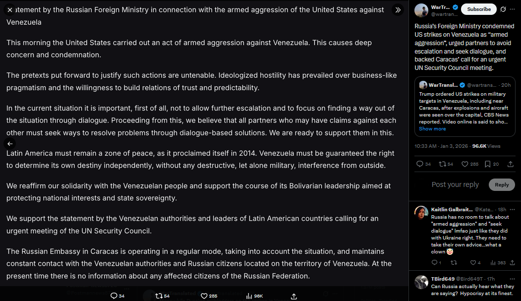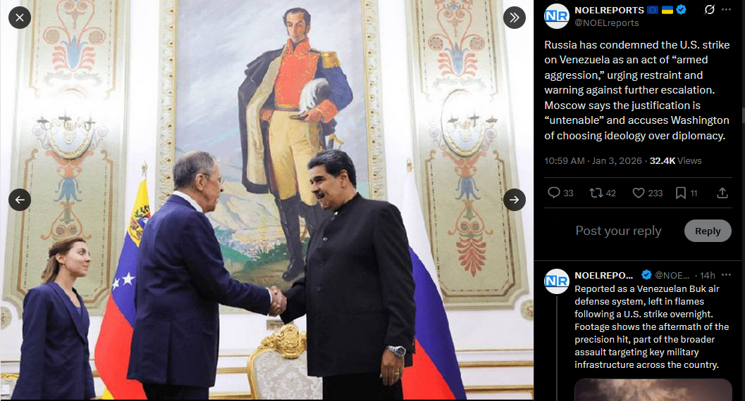 >>525018425Russia has condemned the U.S. strike on Venezuela as an act of “armed aggression,” urging restraint and warning against further escalation. Moscow says the justification is “untenable” and accuses Washington of choosing ideology over diplomacy.https://x.com/NOELreports/status/2007406359839637825?s=20