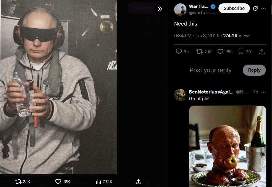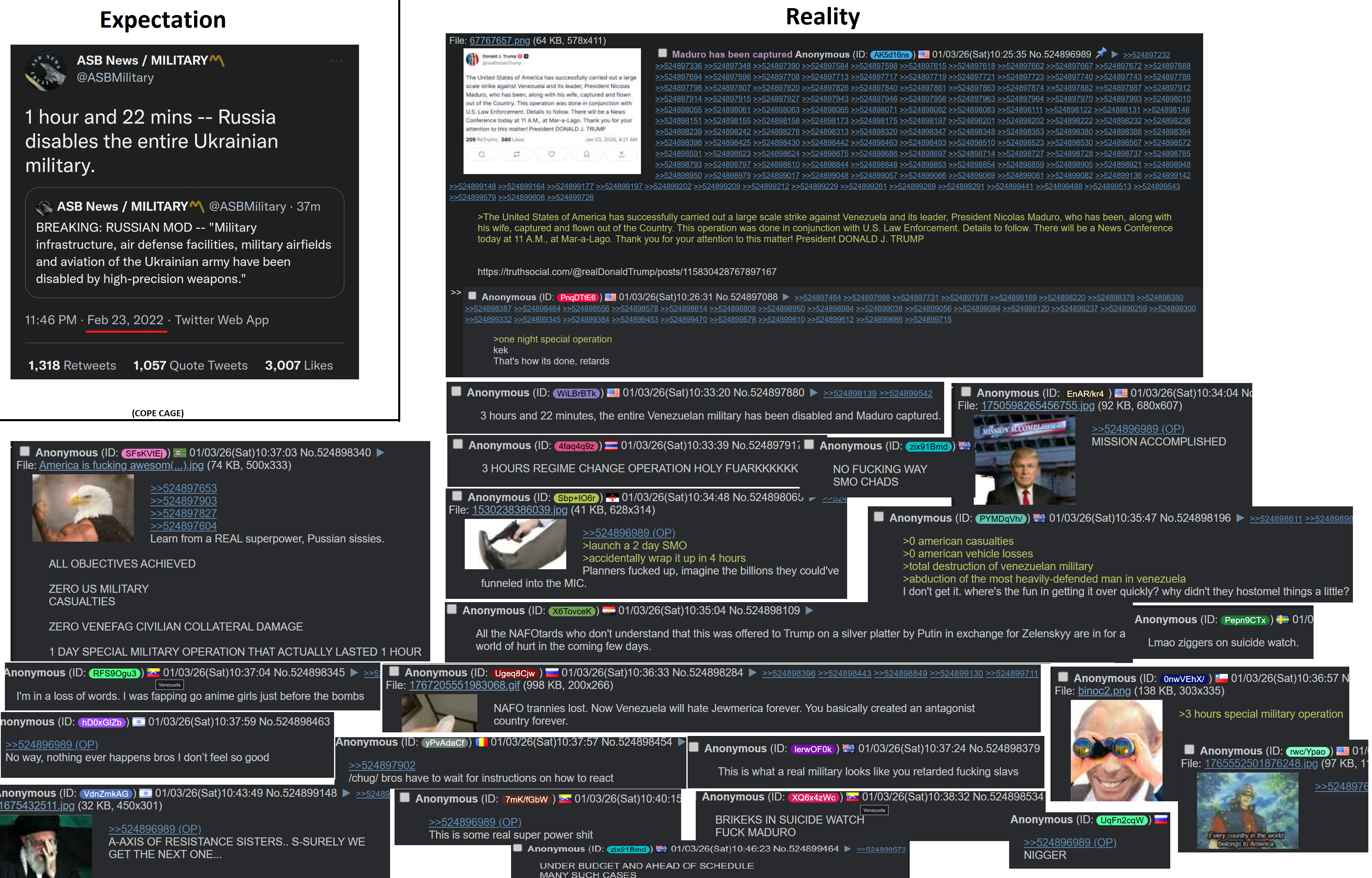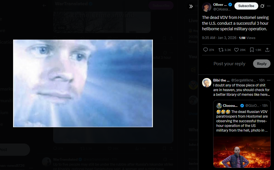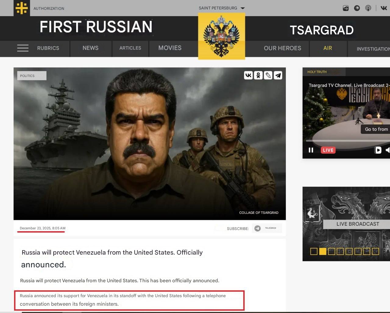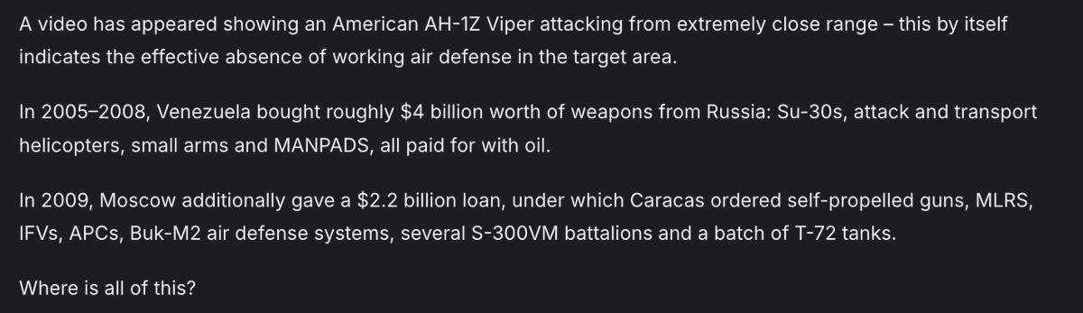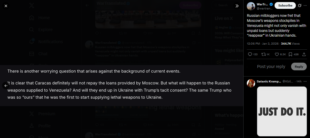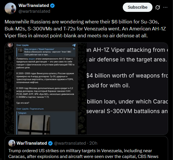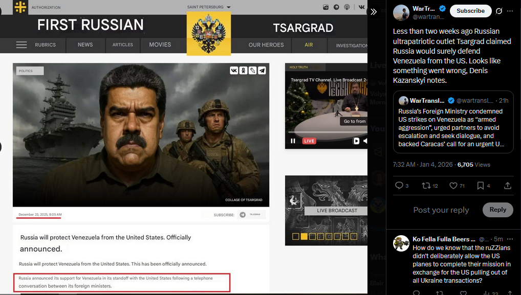 >>525022434Less than two weeks ago Russian ultrapatriotic outlet Tsargrad claimed Russia would surely defend Venezuela from the US. Looks like something went wrong, Denis Kazanskyi notes.https://x.com/wartranslated/status/2007716735676494257?s=20pic 1https://files.catbox.moe/a80xer.jpgpic 2https://files.catbox.moe/6d8x6j.jpg