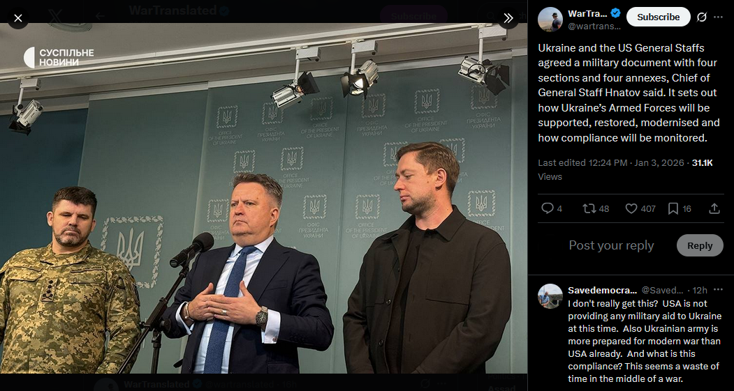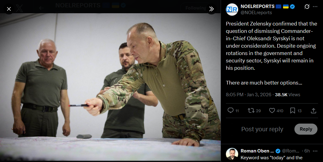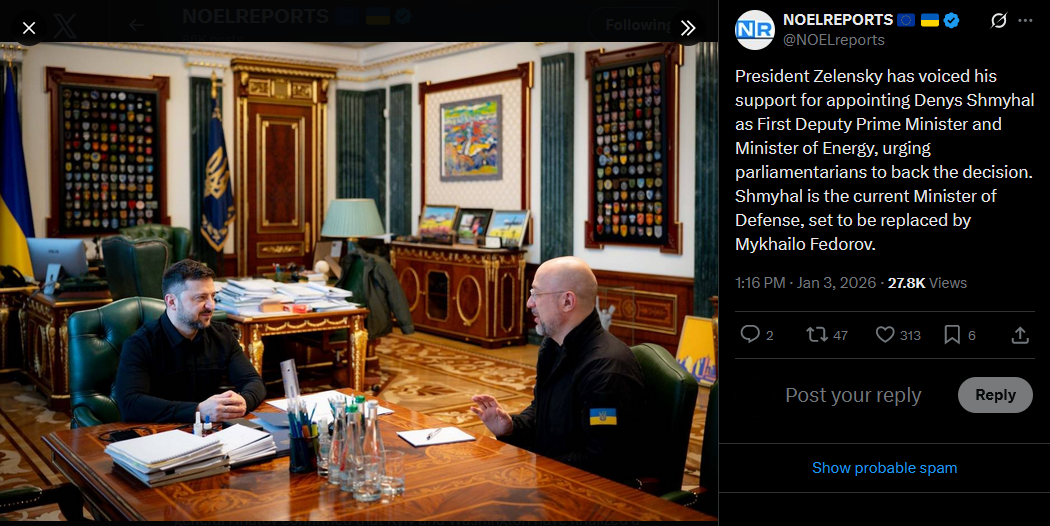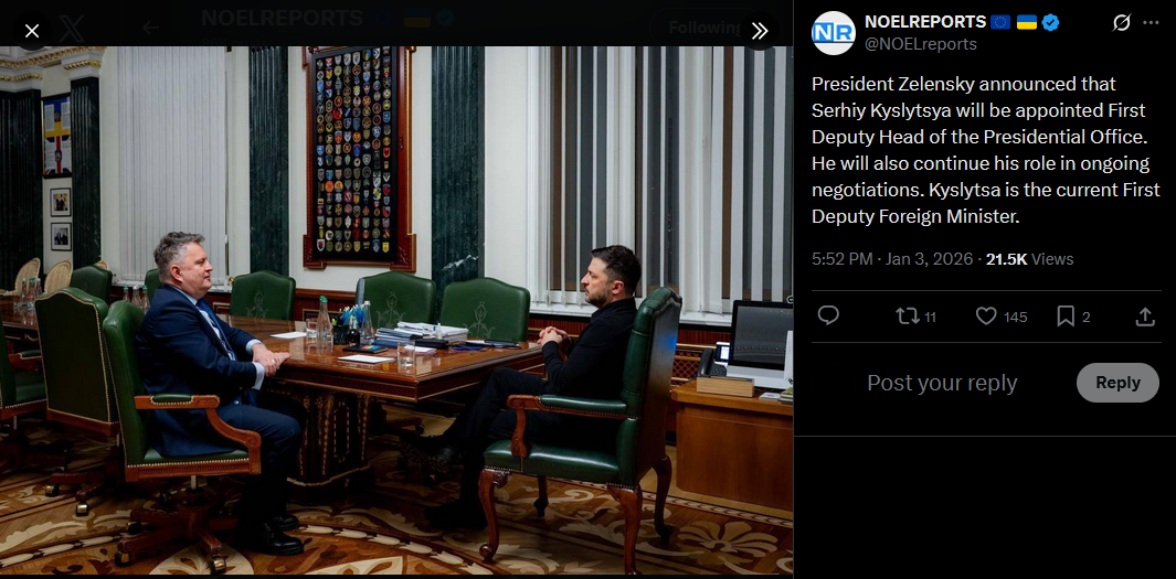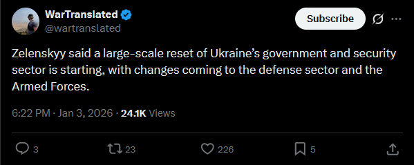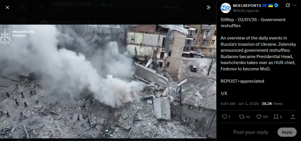 SitRep - 02/01/26 - Government reshufflesAn overview of the daily events in Russia's invasion of Ukraine. Zelensky announced government reshuffles: Budanov became Presidential Head, Ivashchenko takes over as HUR chief, Fedorov to become MoD.https://x.com/NOELreports/status/2007342435027038596?s=20