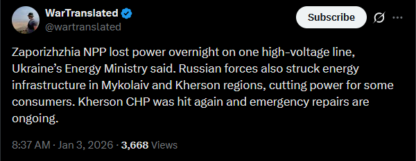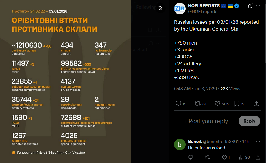 Russian losses per 03/01/26 reported by the Ukrainian General Staff+750 men+3 tanks+4 ACVs+24 artillery+1 MLRS+539 UAVshttps://x.com/NOELreports/status/2007343187992653892?s=20>yesterday
