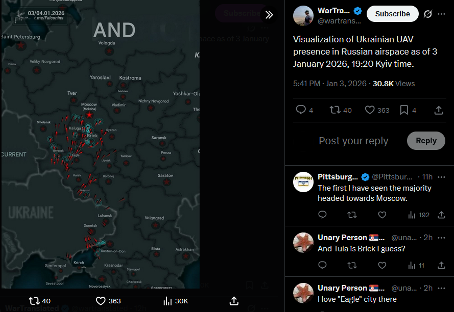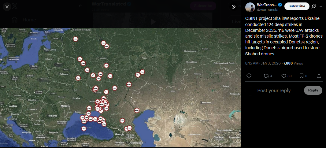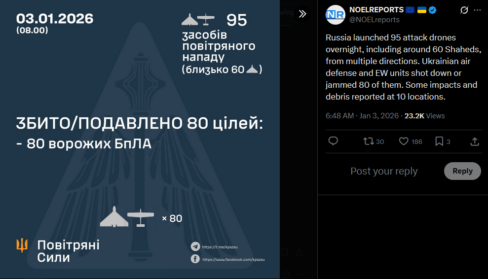 Russia launched 95 attack drones overnight, including around 60 Shaheds, from multiple directions. Ukrainian air defense and EW units shot down or jammed 80 of them. Some impacts and debris reported at 10 locations.https://x.com/NOELreports/status/2007343353986461850?s=20>yesterday