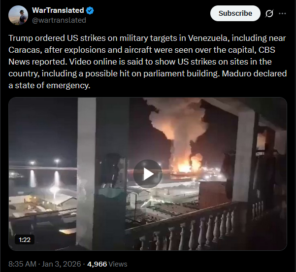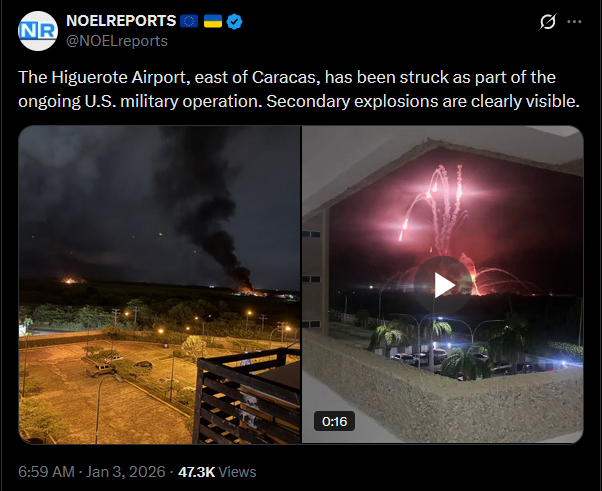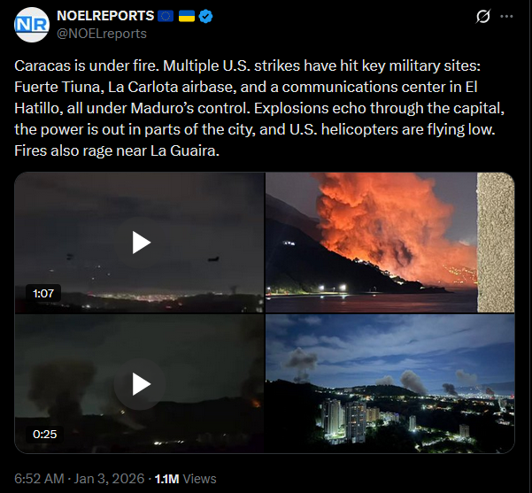 Caracas is under fire. Multiple U.S. strikes have hit key military sites: Fuerte Tiuna, La Carlota airbase, and a communications center in El Hatillo, all under Maduro’s control. Explosions echo through the capital, the power is out in parts of the city, and U.S. helicopters are flying low. Fires also rage near La Guaira.https://x.com/NOELreports/status/2007344295620010360?s=20video 1https://files.catbox.moe/przwg6.mp4video 2https://files.catbox.moe/mtnr8i.mp4pic 1https://files.catbox.moe/tc9cxf.jpgpic 2https://files.catbox.moe/6lft4n.jpg