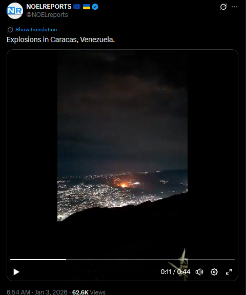 >>525017843Explosions in Caracas, Venezuela.https://x.com/NOELreports/status/2007344735619616982?s=20https://files.catbox.moe/p8w34t.mp4