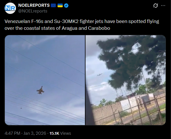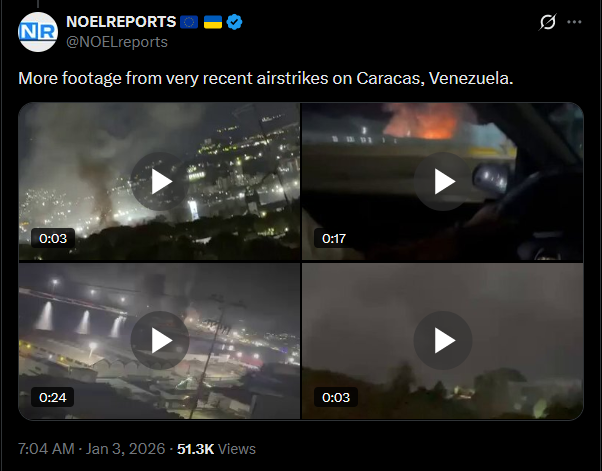 >>525018041More footage from very recent airstrikes on Caracas, Venezuela.https://x.com/NOELreports/status/2007347207218036888?s=20video 1https://files.catbox.moe/c8t4oo.mp4video 2https://files.catbox.moe/7uu14y.mp4video 3https://files.catbox.moe/359act.mp4video 4https://files.catbox.moe/5jggpb.mp4