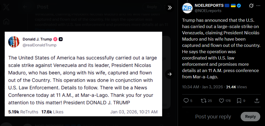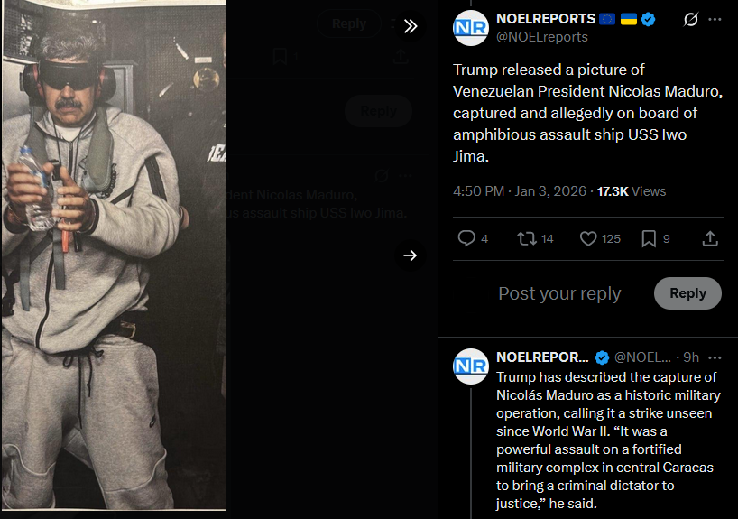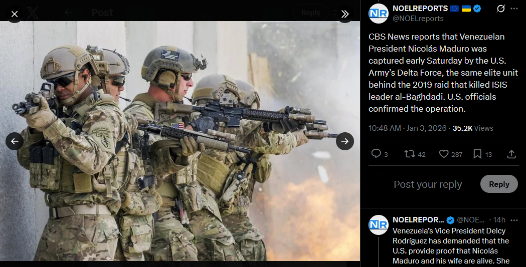 >>525018340CBS News reports that Venezuelan President Nicolás Maduro was captured early Saturday by the U.S. Army’s Delta Force, the same elite unit behind the 2019 raid that killed ISIS leader al-Baghdadi. U.S. officials confirmed the operation.https://x.com/NOELreports/status/2007403671496405019?s=20