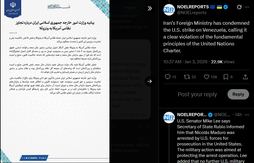 >>525018207Iran’s Foreign Ministry has condemned the U.S. strike on Venezuela, calling it a clear violation of the fundamental principles of the United Nations Charter.https://x.com/NOELreports/status/2007400908259504575?s=20