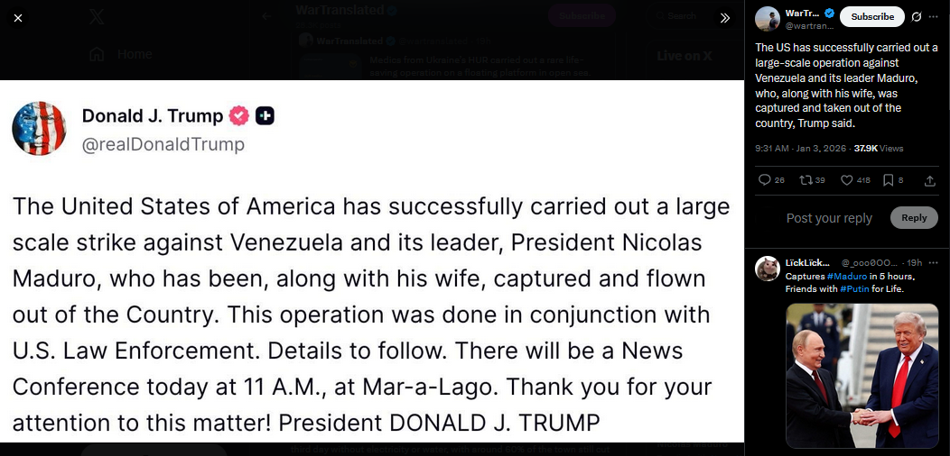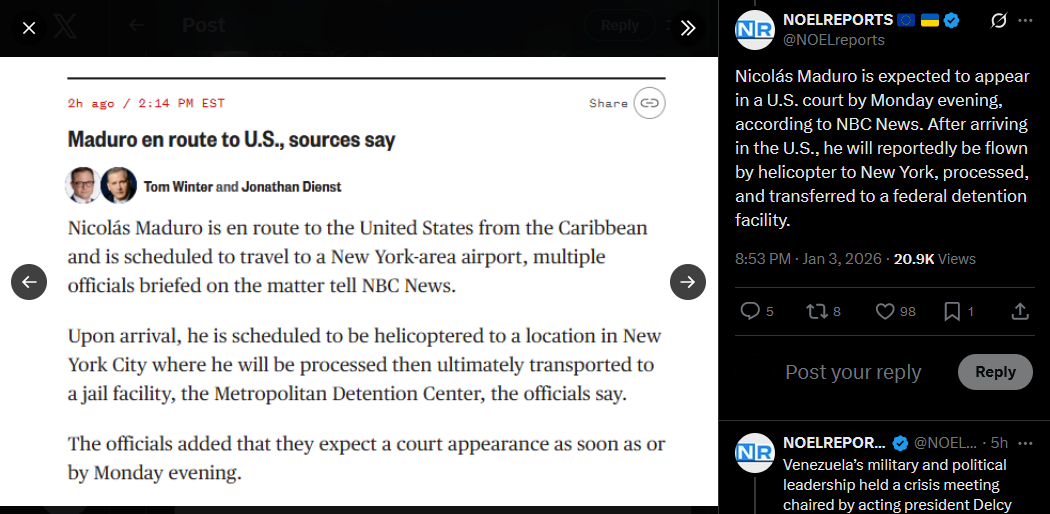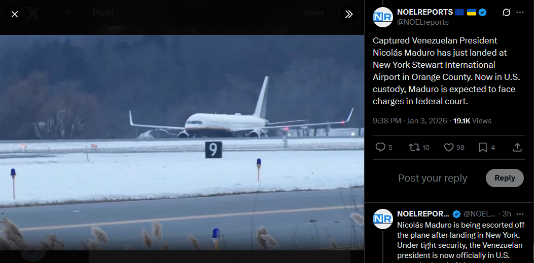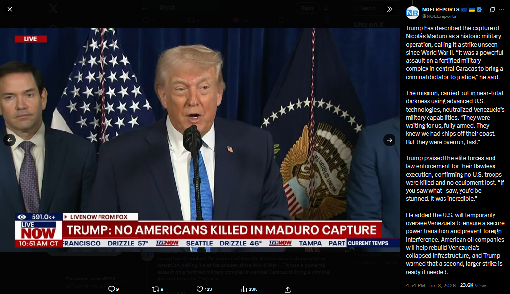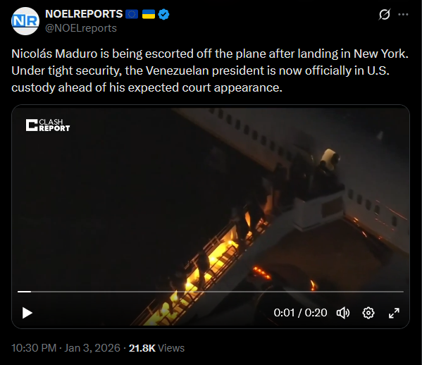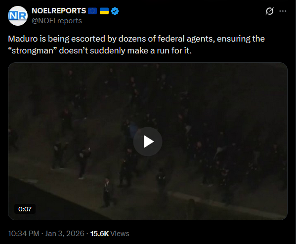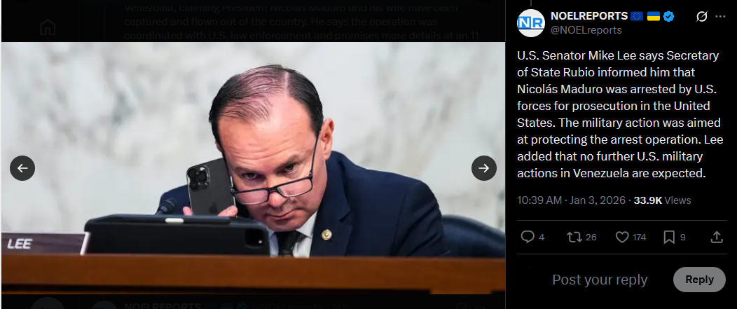 >>525018250U.S. Senator Mike Lee says Secretary of State Rubio informed him that Nicolás Maduro was arrested by U.S. forces for prosecution in the United States. The military action was aimed at protecting the arrest operation. Lee added that no further U.S. military actions in Venezuela are expected.https://x.com/NOELreports/status/2007401493159112820?s=20