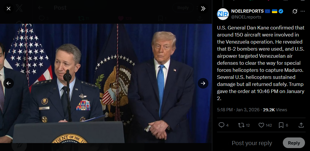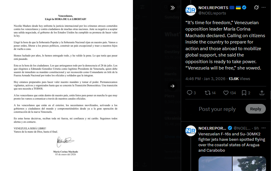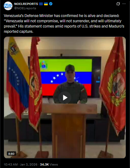 >>525018293Venezuela’s Defense Minister has confirmed he is alive and declared: “Venezuela will not compromise, will not surrender, and will ultimately prevail.” His statement comes amid reports of U.S. strikes and Maduro’s reported capture.https://x.com/NOELreports/status/2007402316845183431?s=20
