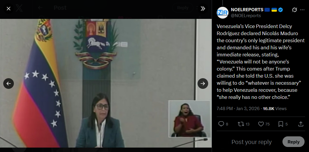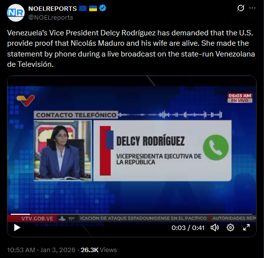 >>525018385Venezuela’s Vice President Delcy Rodríguez has demanded that the U.S. provide proof that Nicolás Maduro and his wife are alive. She made the statement by phone during a live broadcast on the state-run Venezolana de Televisión.https://x.com/NOELreports/status/2007405046284333500?s=20