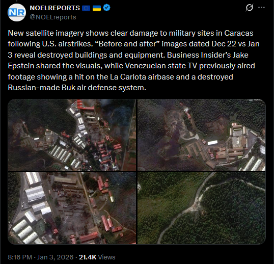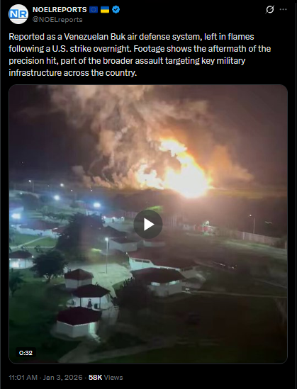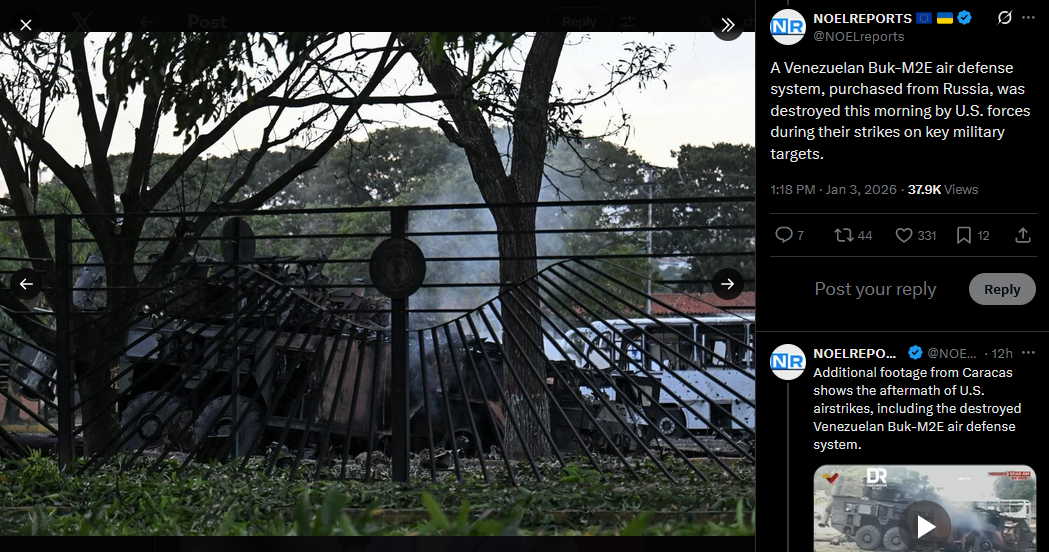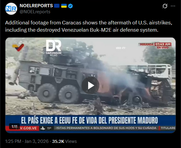 >>525018713A Venezuelan Buk-M2E air defense system, purchased from Russia, was destroyed this morning by U.S. forces during their strikes on key military targets.https://x.com/NOELreports/status/2007441438129193445?s=20