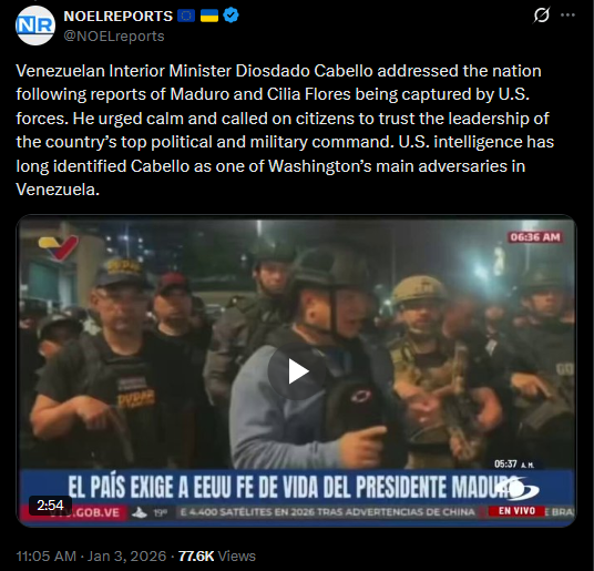 >>525018548Venezuelan Interior Minister Diosdado Cabello addressed the nation following reports of Maduro and Cilia Flores being captured by U.S. forces. He urged calm and called on citizens to trust the leadership of the country’s top political and military command. U.S. intelligence has long identified Cabello as one of Washington’s main adversaries in Venezuela.https://x.com/NOELreports/status/2007407886213759408?s=20