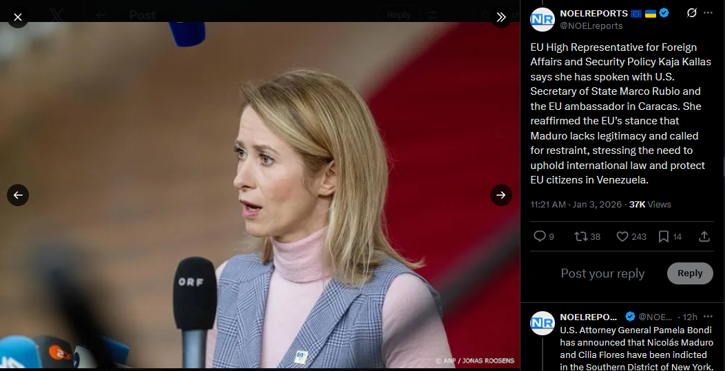>>525018589EU High Representative for Foreign Affairs and Security Policy Kaja Kallas says she has spoken with U.S. Secretary of State Marco Rubio and the EU ambassador in Caracas. She reaffirmed the EU’s stance that Maduro lacks legitimacy and called for restraint, stressing the need to uphold international law and protect EU citizens in Venezuela.https://x.com/NOELreports/status/2007411952151134329?s=20