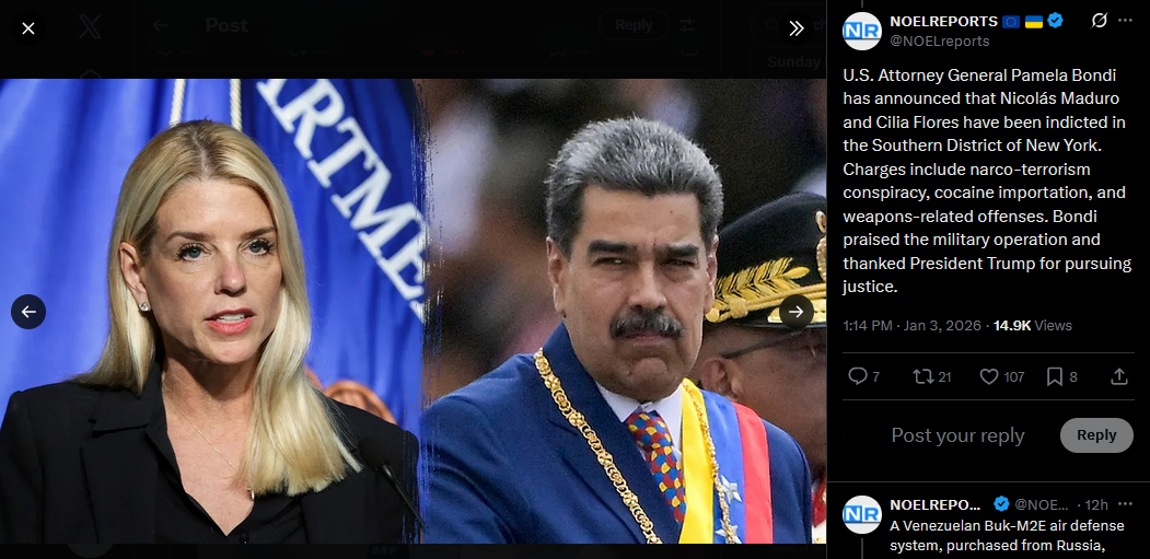 >>525018641U.S. Attorney General Pamela Bondi has announced that Nicolás Maduro and Cilia Flores have been indicted in the Southern District of New York. Charges include narco-terrorism conspiracy, cocaine importation, and weapons-related offenses. Bondi praised the military operation and thanked President Trump for pursuing justice.https://x.com/NOELreports/status/2007440474580144339?s=20