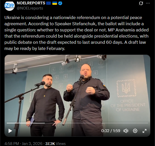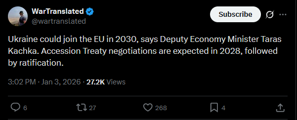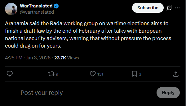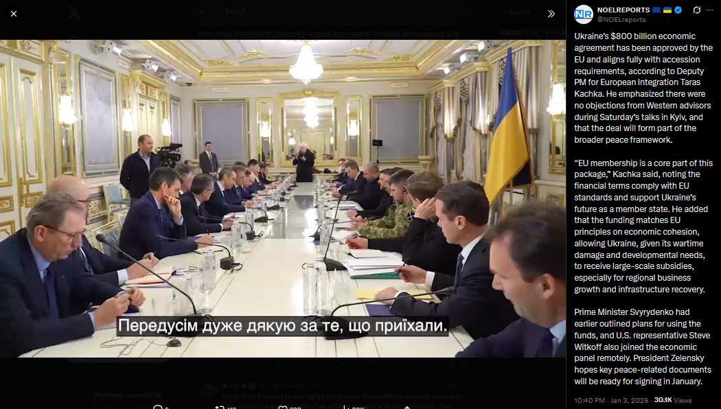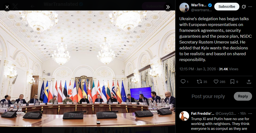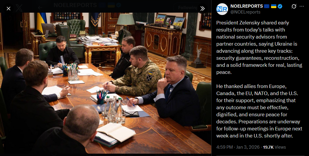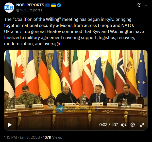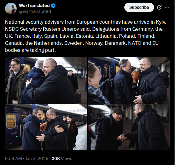 National security advisors from Germany, the UK, France, Italy, Spain, the Baltics, Poland, Finland, Canada, the Netherlands, Sweden, Norway, Denmark, NATO, the EU Council, and Commission have arrived in Kyiv. Today, they’ll work with Ukrainian officials on security, economic issues, and framework agreements.https://x.com/NOELreports/status/2007401064434147347?s=20>23h