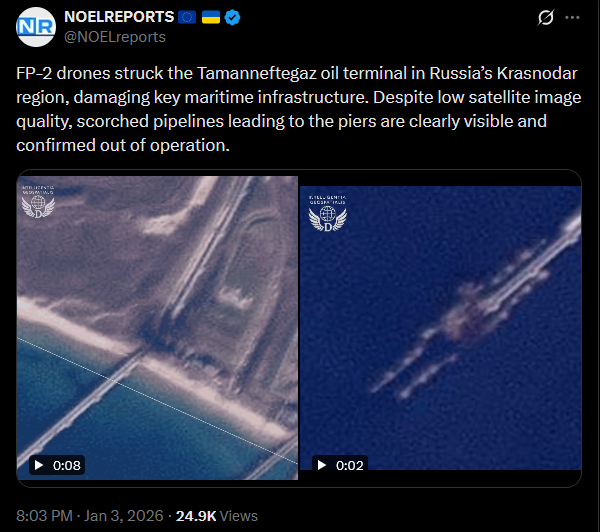 Previous: >>525000767Day 1,411 – Daily assessment: understandingwar.org/analysis/russia-ukraine/#research▶Latest>Zelensky has proposed appointing Mykhailo Fedorov as the country's new defense minister>pidors panicking in response to US 3 hour SMO>pidors fake a video about drone attack on monke's palace>Budanov is the new Head of President's Office, New HUR glowie is Oleh Ivashchenko>Rumours about Kadyrov being dead>White Rex lives, it was all a hoax to steal bounty money>many targets hit inside russia over new years, including refineries, depots, pipelines, substations, radars, warehouses, drone launch pads>Tuapse refinery on fire, large outgoing drone attack>Second Logistics Hub in Romania to Be Opened for Ukraine>Syzran refinery struck>The Russian Ministry of Defense released footage of the withdrawal of its troops from Kupyansk as proof of control over the city>The Ukrainian Armylaunched a counterattack north of Pokrovsk and have retaken Suhketske, Suvorove and the Krasnolymanskaya Mine north of Rodynske.>140 refineries and oil depots hit in 2025, +50% yoy>170k named and verified dead rusniggers t. poteru + gorushko>NEW DEAD rUSSIAN GENERAL: Fanil Sarvarov>russians have started using horses for meat assaults due to running out of armour.>Ukraine said it used British Storm Shadow missiles to attack the Novoshakhtinsk oil refinery>russia admits the loss of Kupyansk and nearby villages▶Telegramrentry.org/telosint2023t.me/ukr_pics▶Intelt.me/DeepStateENodin.tradoc.army.mil/WEG (equipment explorer)ukr.warspotting.net (visually confirmed losses)▶Mapsdeepstatemap.live/enliveuamap.com/en▶DISPOSABLE SOLDIER (diary of a RU mobik)TOURS 1-4: files.catbox.moe/mpcw7p.zip▶12 min of TZD in one ditch (Pokrovsk area) - 28 killedfiles.catbox.moe/sxbxfb.mp4