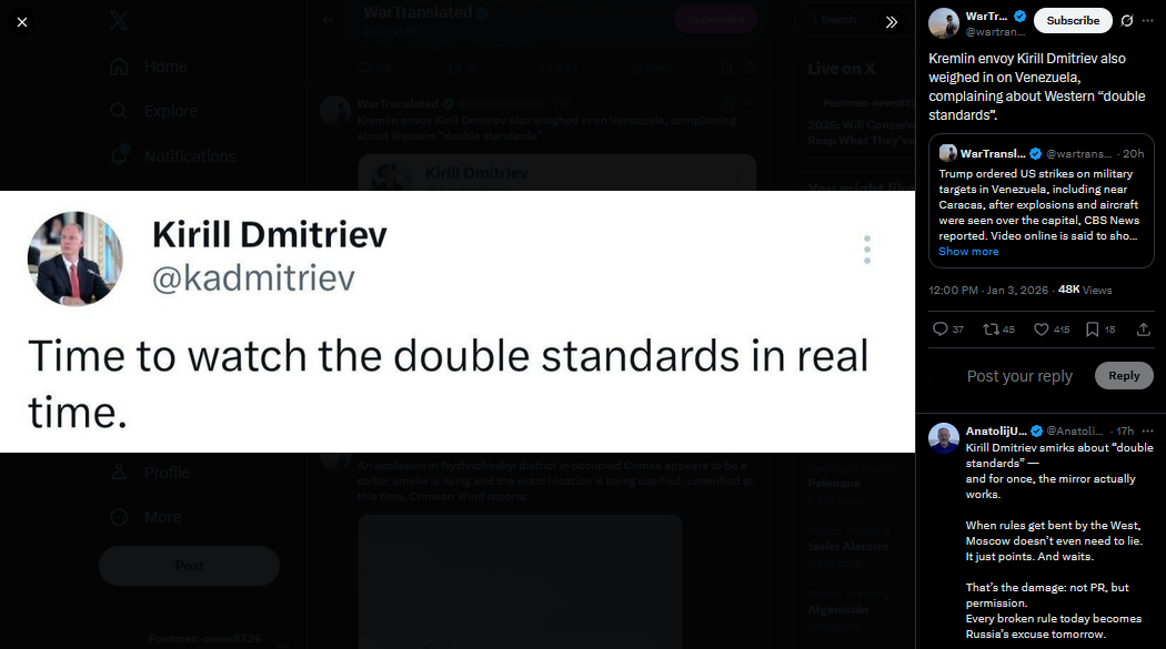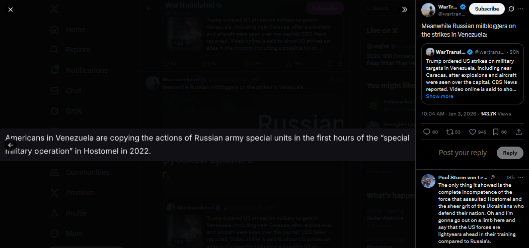 >“So Putin can be kidnapped.” Z-military correspondents called the US operation against Maduro a “standard SVO”>The rapid US operation against Venezuela, which ended with the arrest of the country's President Nicolas Maduro, caused a wave of admiring comments from the pro-military z-community, despite the fact that Russia and Venezuela are bound by a strategic partnership agreement, which includes military-technical cooperation.>Lasting only 30 minutes, the attack, which included a series of airstrikes and a CIA operation to capture and remove Maduro, is a “standard military action,” writes Military Whistleblower.>“They arrived, did the job, flew away,”- he describes the situation: the United States “punched out a corridor” for the flight of helicopters with special forces, simultaneously destroying several targets in the country, and after the capture of Maduro they immediately left it.>“So Putin can be kidnapped,” worries the Novorossiya Militia Reports channel. “Two Majors” call the US operation “competent,” “fast,” and“effective.” “Surely, this is how our SVO was conceived. It’s unlikely that Gerasimov planned to fight for 4 years,” the channel complains.>“Some of the things that the United States did were exemplary,” writes Rybar. In 2022, the Russian army also tried to capture the Kiev Gostomel airfield with the help of landing forces, and then in a similar manner took the Antonovsky Bridge in Kherson, to cross the Dnieper, however, “those tactical successes could not be turned into strategic ones,” states Rybar.>“If we want it like the Americans,” then we first need to understand what exactly we want and what we can actually do from it. Without sober analytics there will be no normal conclusions, and without them there will be the same rake,” writes the channel.