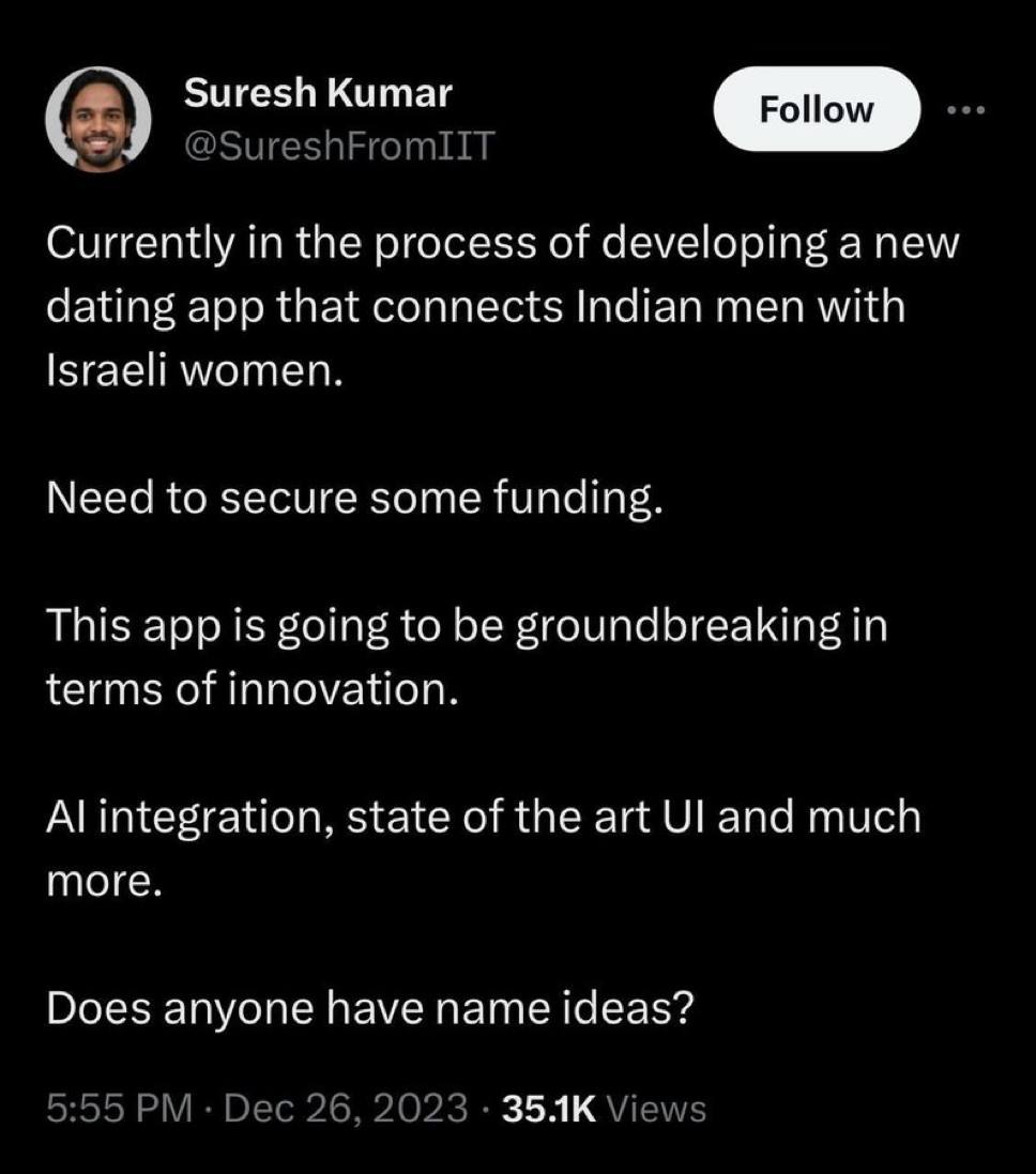 >>525092815hello saar. Why are jews jewing themselves? I have never seen an Israeli on twitter say something nice about indians, why the fuck are you guys bringing thousands of Indians there?