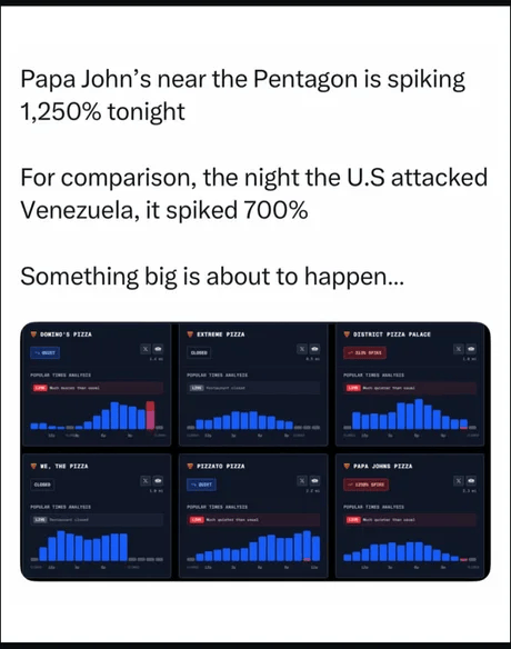 >>525204569The pizza index is pretty widely known at this point. They're certainly aware of it and may choose to game it. Indeed there were tons of pizza orders on multiple occasions on which nothing happened.