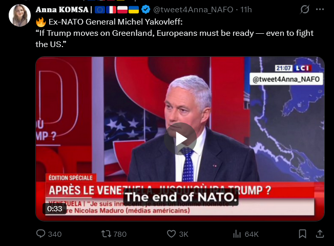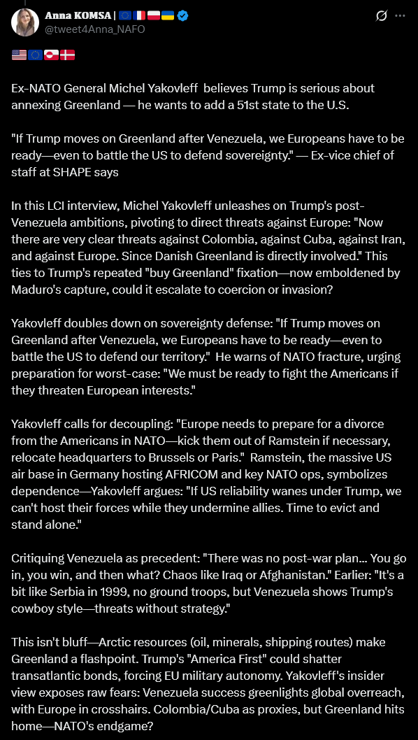 TRUMP YOU ARE ON NOTICEIF you put your crusty orange paws on Greenland, Europe WILL be on a war footinghttps://x.com/tweet4Anna_NAFO/status/2008374886423519614